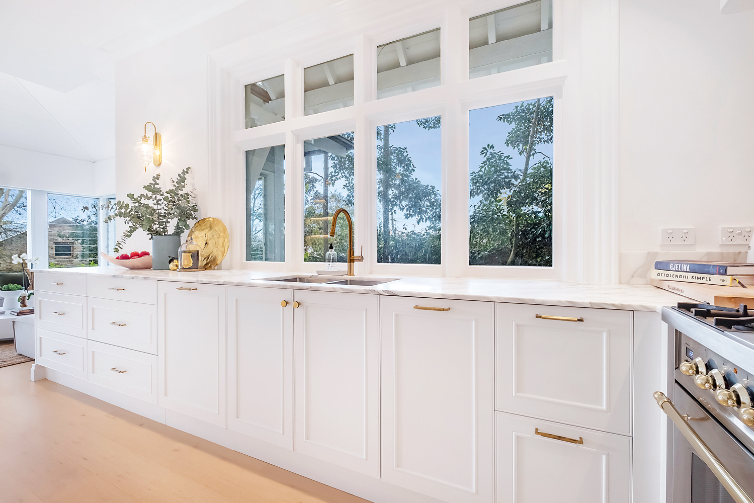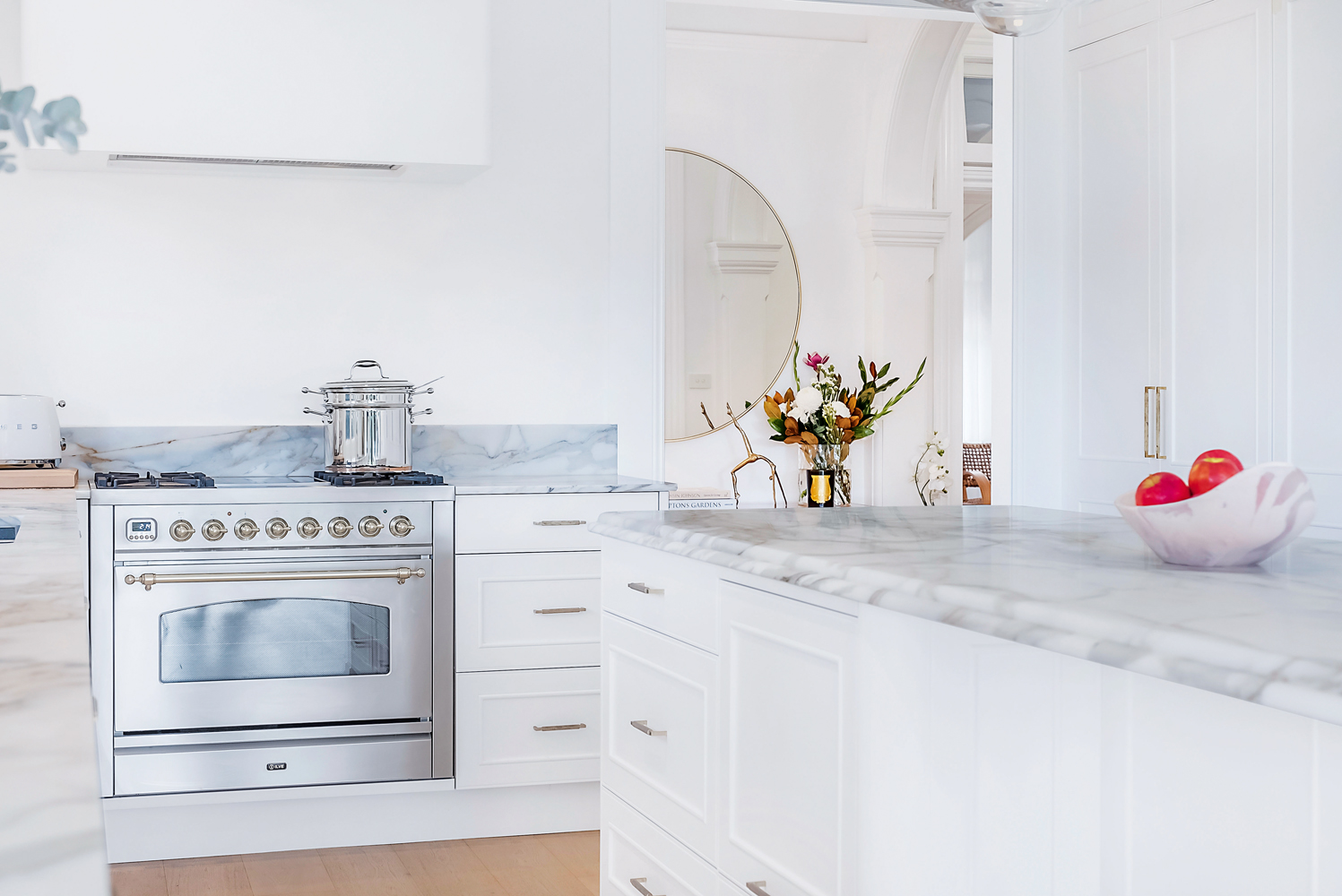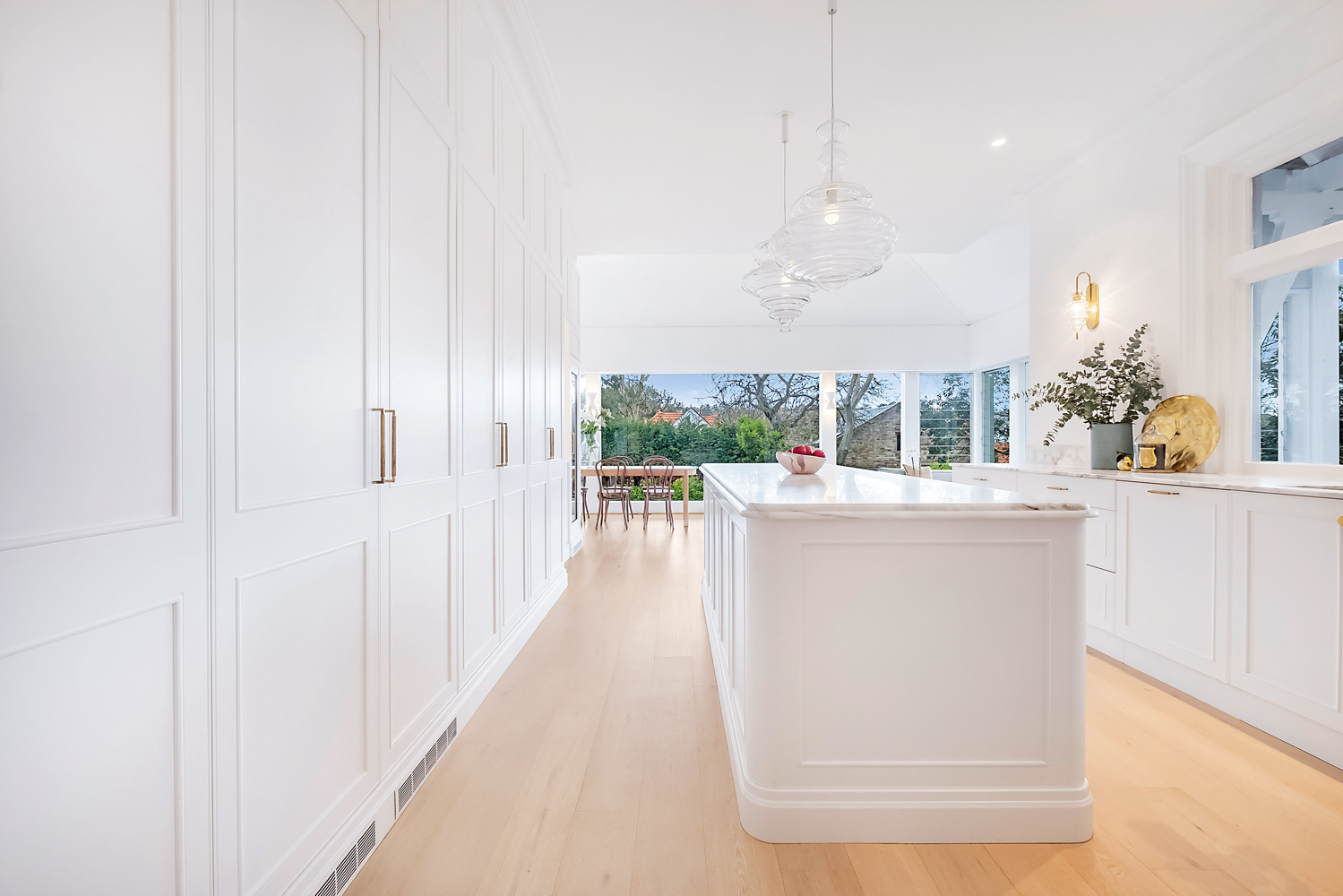To ensure durability and timelessness, high-quality joinery and finishes were used throughout the kitchen. The shift from a Shaker-style profile to a customised Tuscany profile with a V-groove on the exterior edges and Vivid White colour brought an open and timeless look to the space.