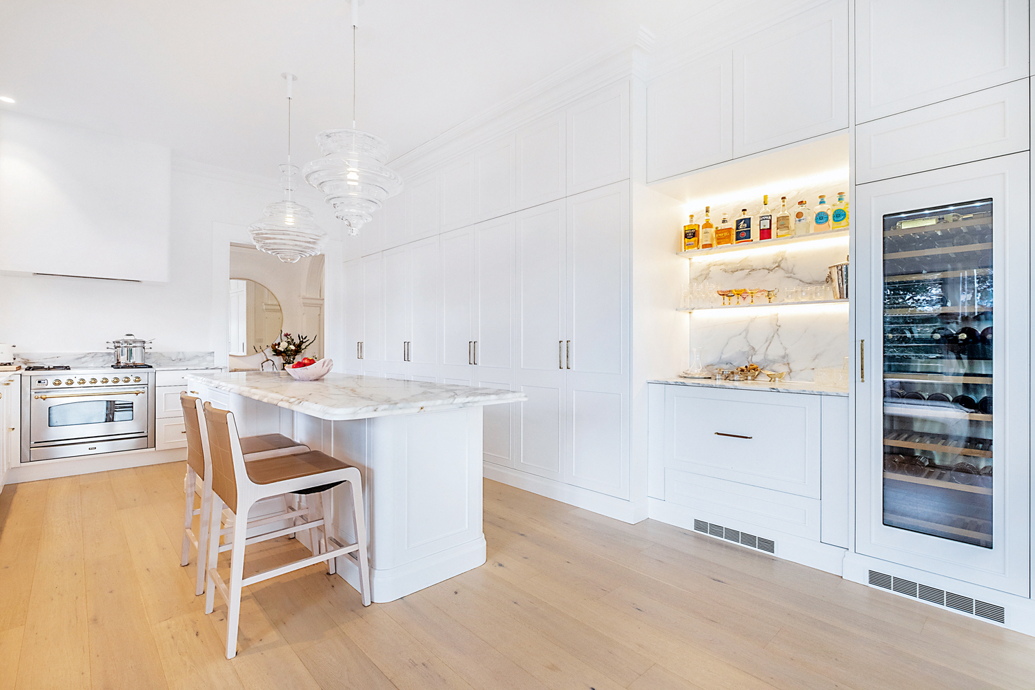 Designed for a young family which loves entertaining, the kitchen was crafted to be an inviting space for everyday use and a real “entertainer’s delight”. The addition of a built-in bar seamlessly connects the kitchen, dining and living areas, creating a harmonious flow for social gatherings.