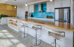 The benchtop has a shadowline finish for a sleek look. The turquoise glass splashback and bamboo feature tops and shelves provide a pleasing mix of colour, while the combination of spot and pendant lighting allows different atmospheres to be created. A polished concrete floor keeps things contemporary, and the Laminex doors and panels proved the ideal choice for this modern beauty.”