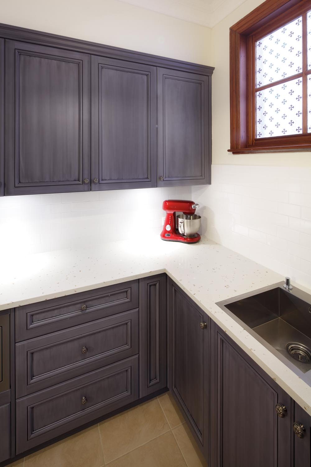 “The focus for this design was for it to reflect the Federation style of the home and make the most of a very tight space. Although the cabinets are finished in a dark colour, they don’t close in the space as they are balanced by the gloss white tiles and benchtop that has a pearly fleck through it, which sparkles in the light. The decorative film on the window also allows a lot of light in. Due to the limited space, the pantry, fridge and freezer are housed just outside the archway to the kitchen. Integrating the appliances was key to making them look like pieces of furniture that still tie in with the kitchen, rather than the kitchen just ‘spilling over’ — and they are still close enough to be practical. Integrating the microwave under the bench also allows for a good flow of benchtop space.”