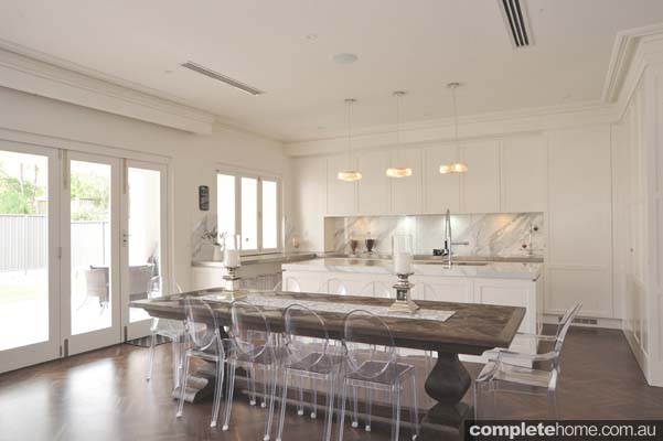 “With timeless sophistication, this kitchen is a pure vision of traditionalism combined with contemporary influences. Containing finger pine handles, the cabinets display the simpleness of its appearance and illuminate the textural features of the marble benchtop. The concept of space is inviting as the owner’s pantry door opens to reveal a preparation sink, bench and fridge to create an entertaining and intimate kitchen. Brands of refined quality including Fisher and Paykel, Miele and Smeg adorn this enduring classic. European oak timber floors are reflective of old Paris and give this kitchen a supreme elegance which will remain graceful beyond its years.”
