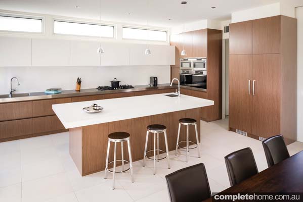 “The owners of this striking kitchen knew exactly what they wanted – a clear and contemporary kitchen design. They researched their materials and drew a draft of their dream kitchen plan. The sizable open-plan hinterland behind the generous island provides functionality and aesthetically good looks. The owners loved the glossiness of veneer, the cleanliness of stainless steel and the durability of stone. The striking contrast between the chocolate wood grain-look doors and stark whiteness of the gloss creates elegance and a sense of open space. Playing with horizontal lines creates an illusion of enhanced space. After browsing through a wide range of colours, we designed the kitchen to suit their needs and lifestyle by making it functional and tasteful. The kitchen colour schemes have proved a touch of intrigue never goes unnoticed.” Designer: Asher Kaicer for Alltype Kitchens, alltypektchens.com.au