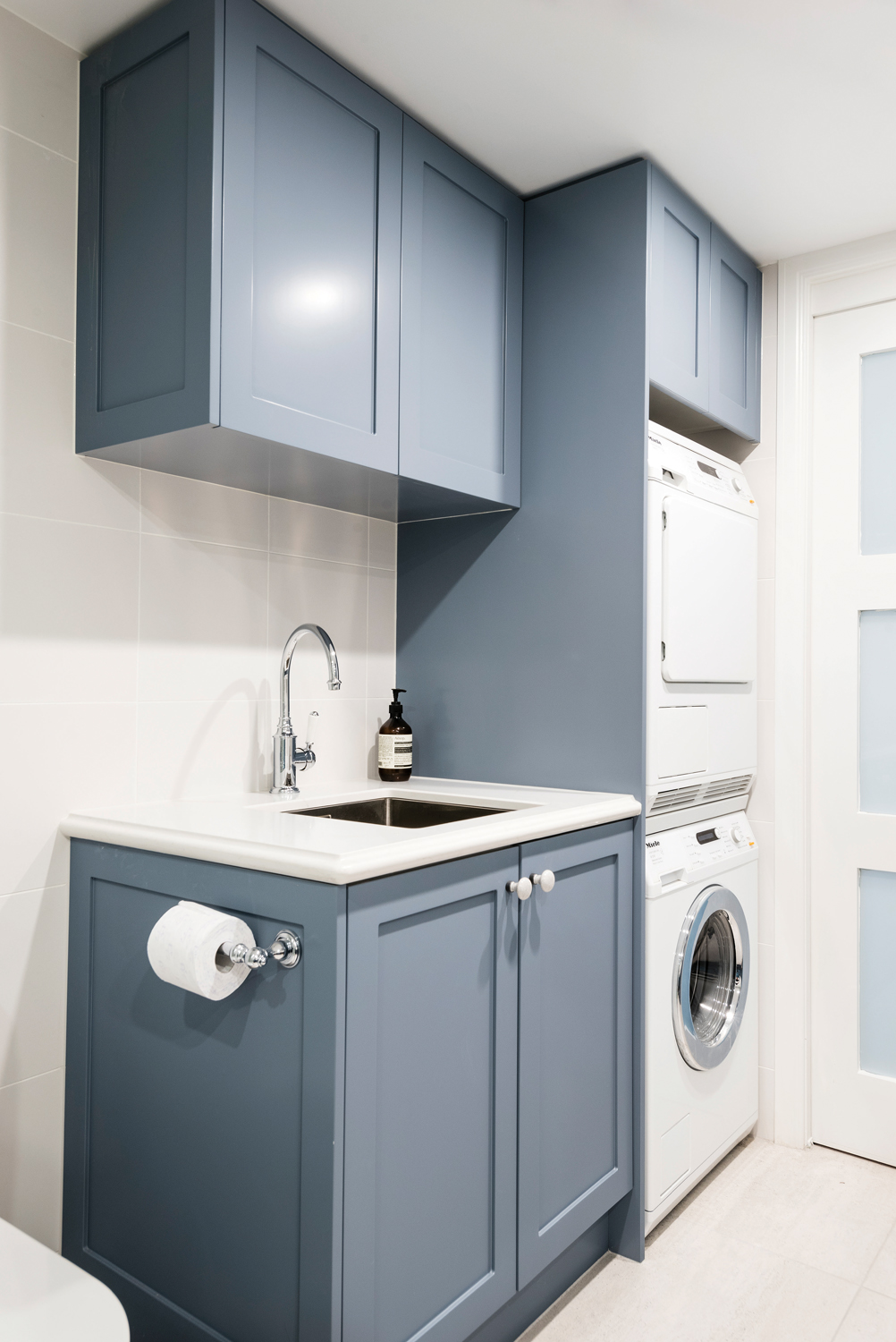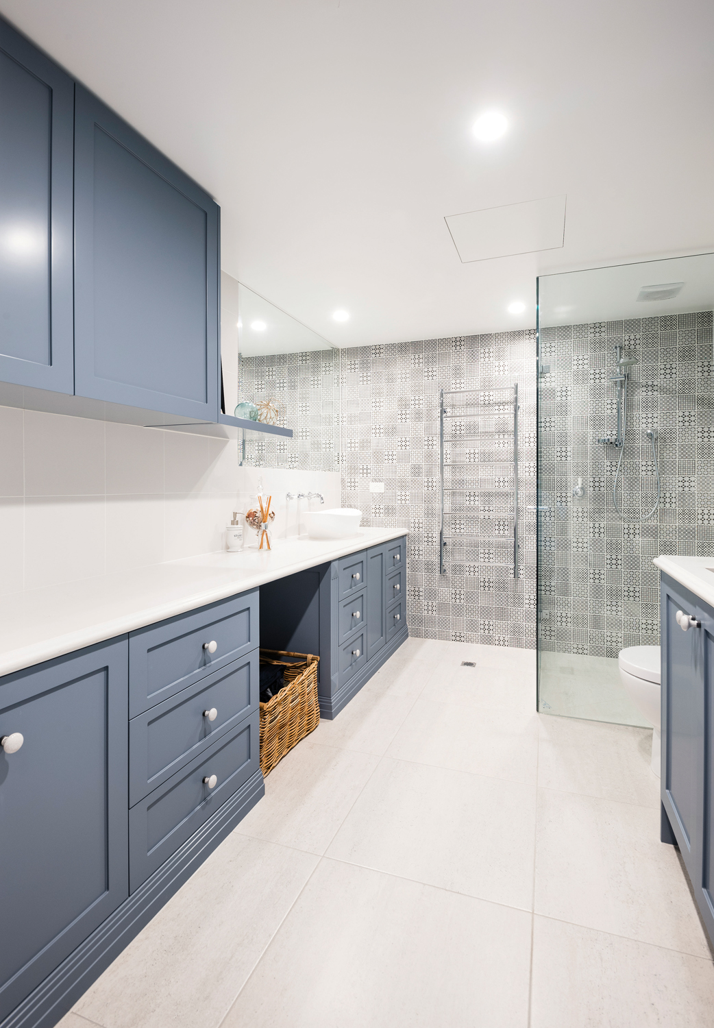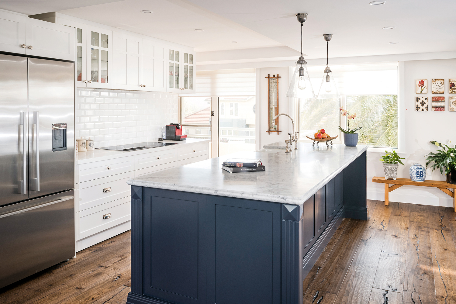 By keeping the colour scheme minimal and using ocean-inspired gunmetal blue for the island bench, a light and airy atmosphere of relaxed beachside living was achieved. Dado panelling was used on cabinets, doors and bench bottoms to really ramp up the Hamptons feel, with the island bench featuring deep-profile forward skirting and diamond-topped pilasters.