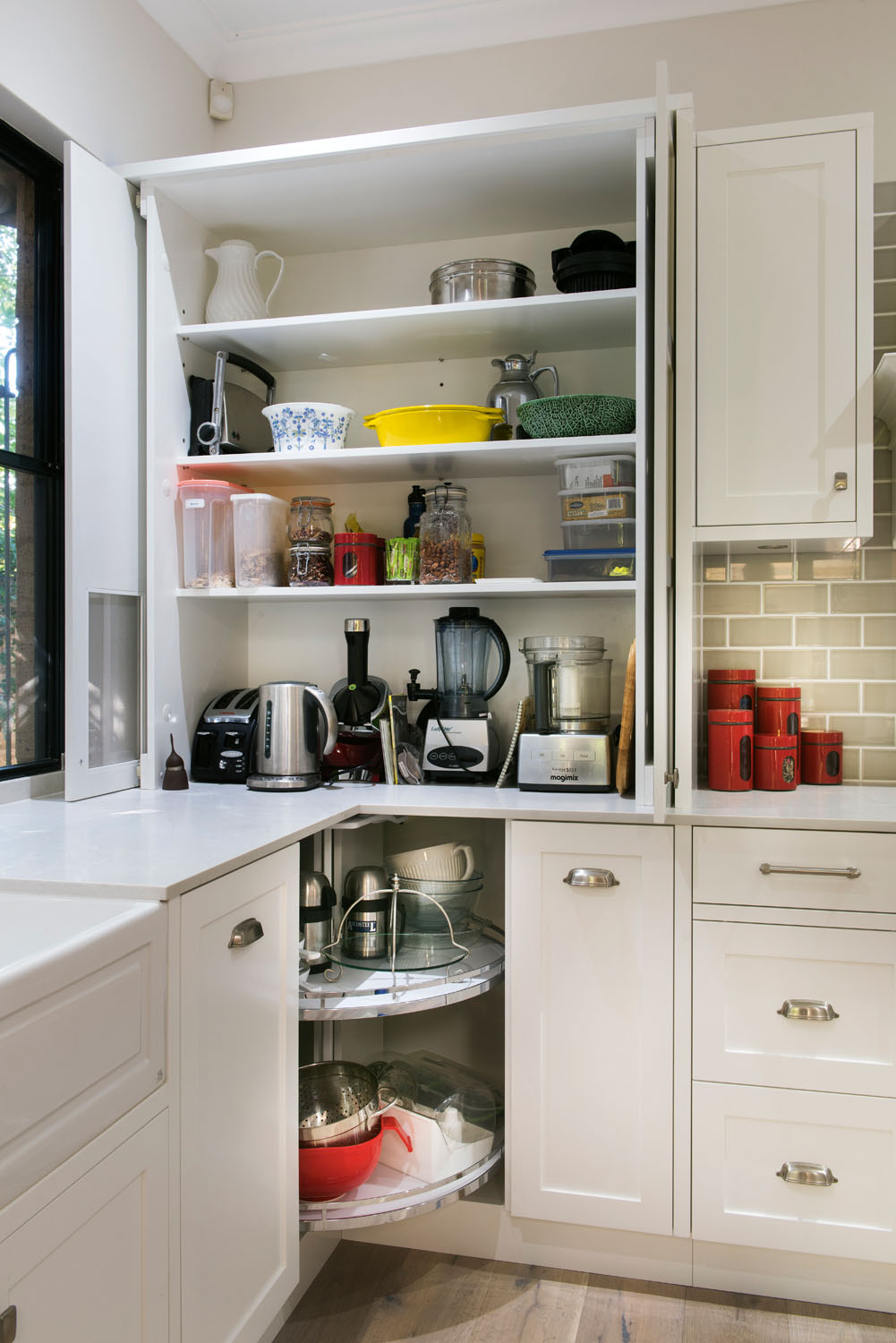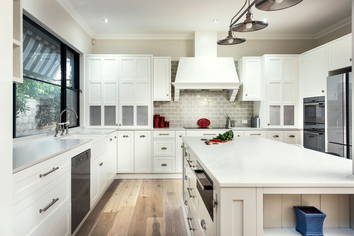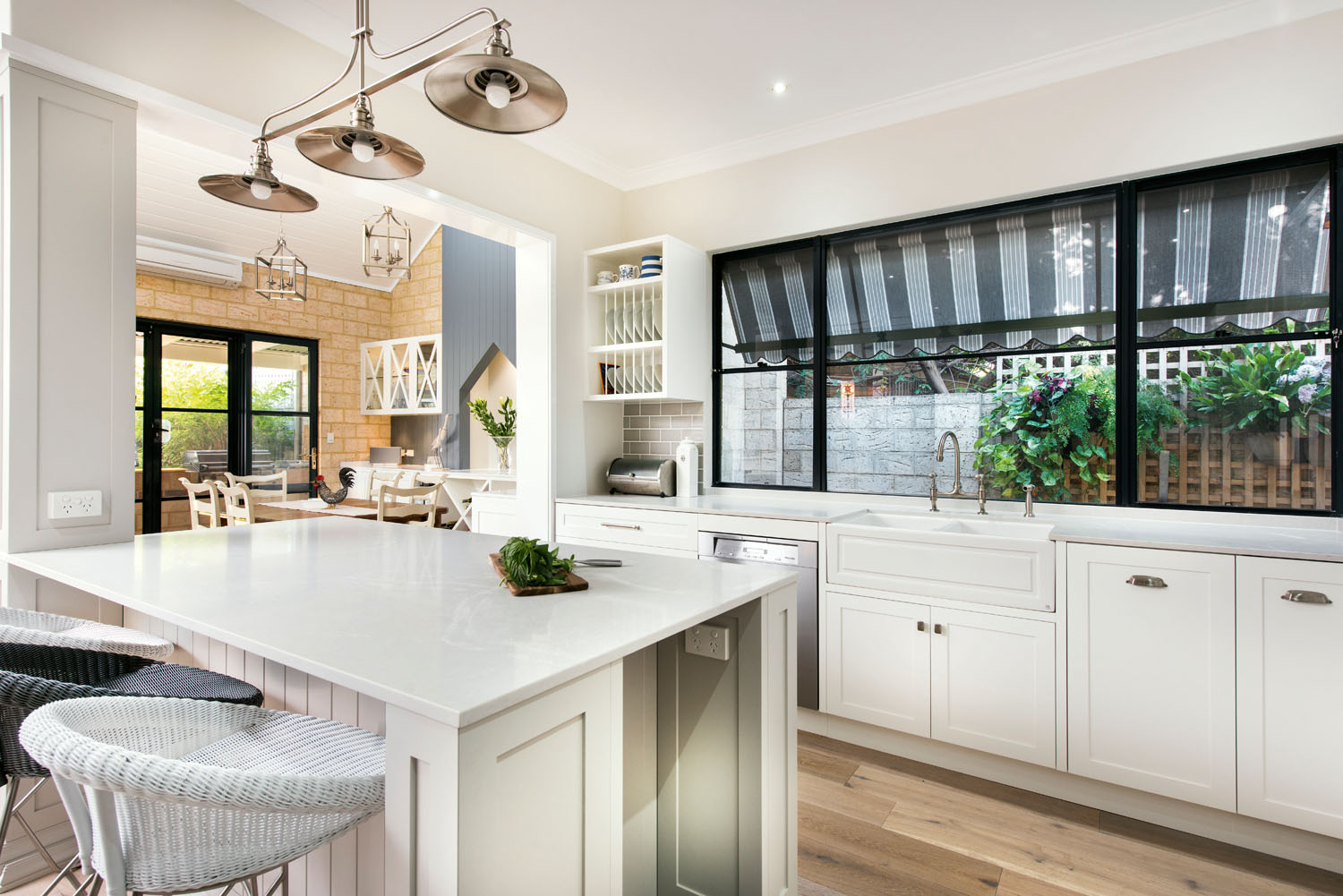 “Updated from an older, country-style kitchen with separate dining, this neutral modern hub is a great example of how to incorporate distinct yet connected zones for storage, preparation and cooking. The original English and American Shaker aesthetic has been maintained to encourage cohesion throughout the home, but modern industrial touches and beautiful big windows bring the outdoors in and add colour to this neutral space. Storage is amply provided for, with corner cabinets and counter level doors a perfect place to stow pots, pans and your favourite appliances. A dishwasher and prep sink in the dining room allows for easy socialising with guests while you set up and clean up, while a breakfast bar at the island bench makes a great option for casual meals.”