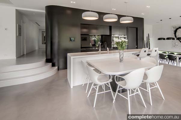 The curved black rear wall complements a recurring design feature found throughout the Brighton property. Integral finger-pulls accentuate the flow to give a sleek handle-free look. Entertaining becomes a theatrical event, with the state-of-the-art cooking station in full view of the dual-level T-shaped island bench and casual dining table.