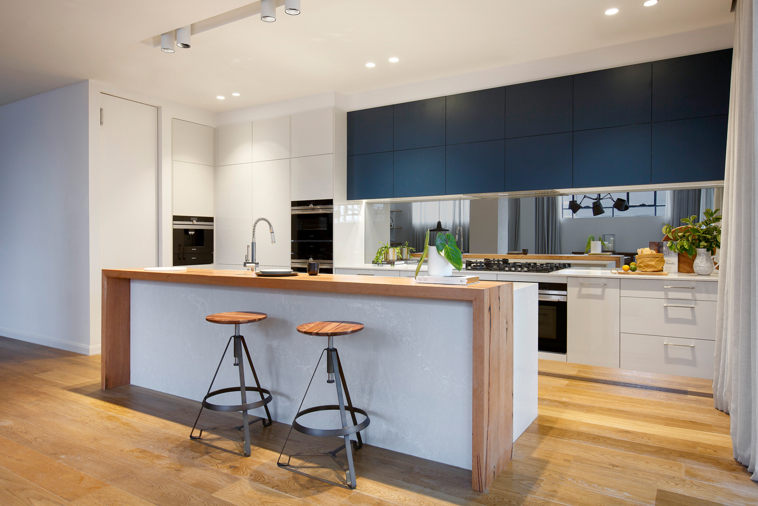 By pairing Alaskan Gloss cabinetry in Royal Oyster with Flair Deep Sea top cabinetry and Caesarstone Alpine Mist benchtops, this kitchen is both slick and functional. It also boasts Siemens appliances, the biggest butler’s pantry on The Block and a plethora of cupboards and drawers.