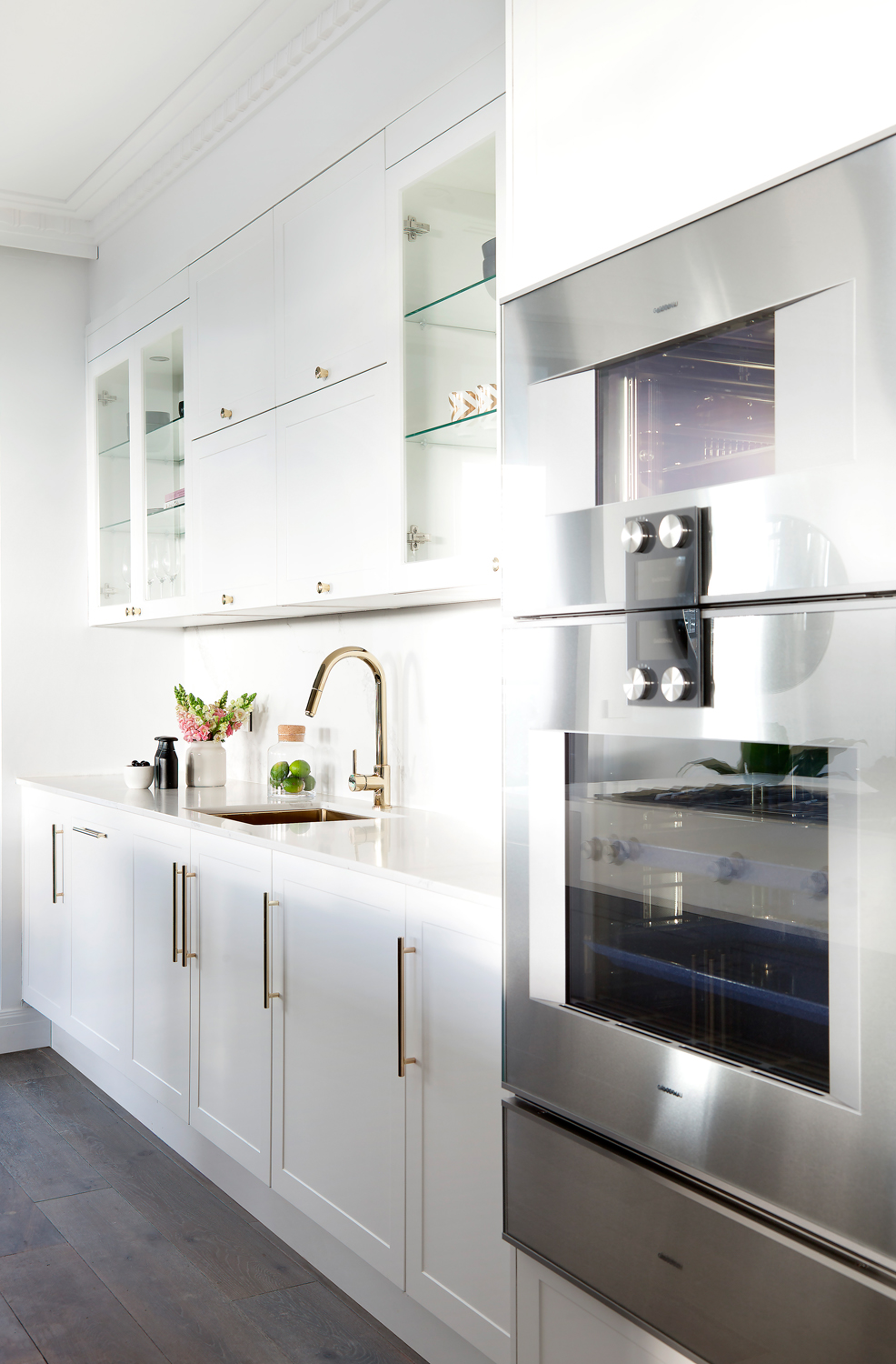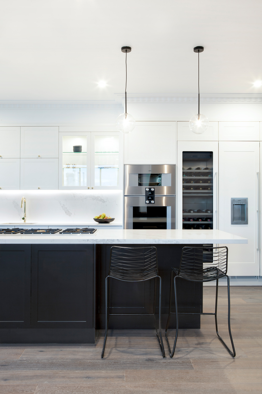 Oozing luxury and glamour, this kitchen is a modern take on the traditional Shaker style. Featuring stunning Gaggenau appliances throughout, Caesarstone Statuario Maximus benchtops, and splashback and Shaker style cabinetry in matte white and black; this is a kitchen that demands attention.