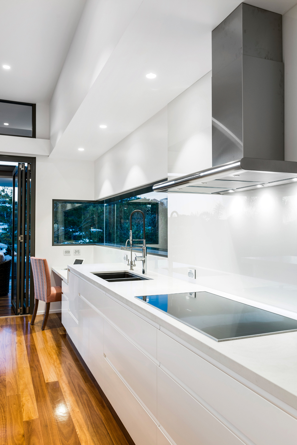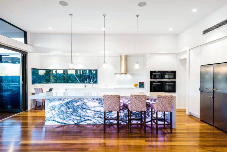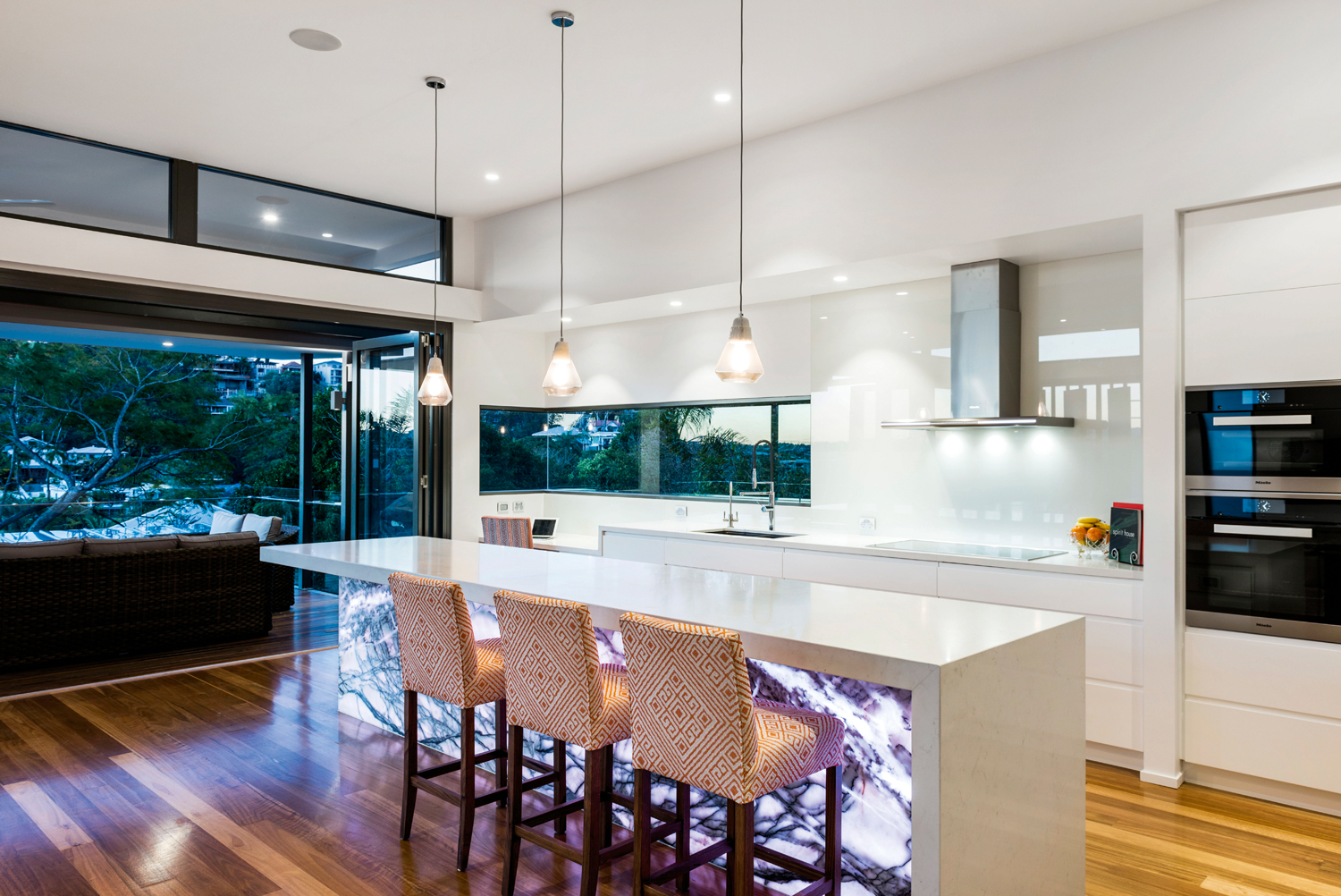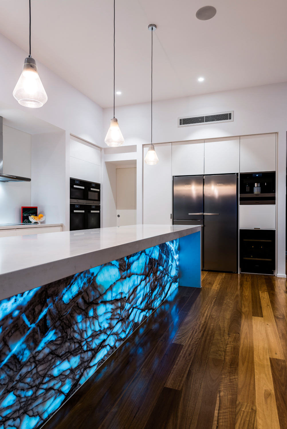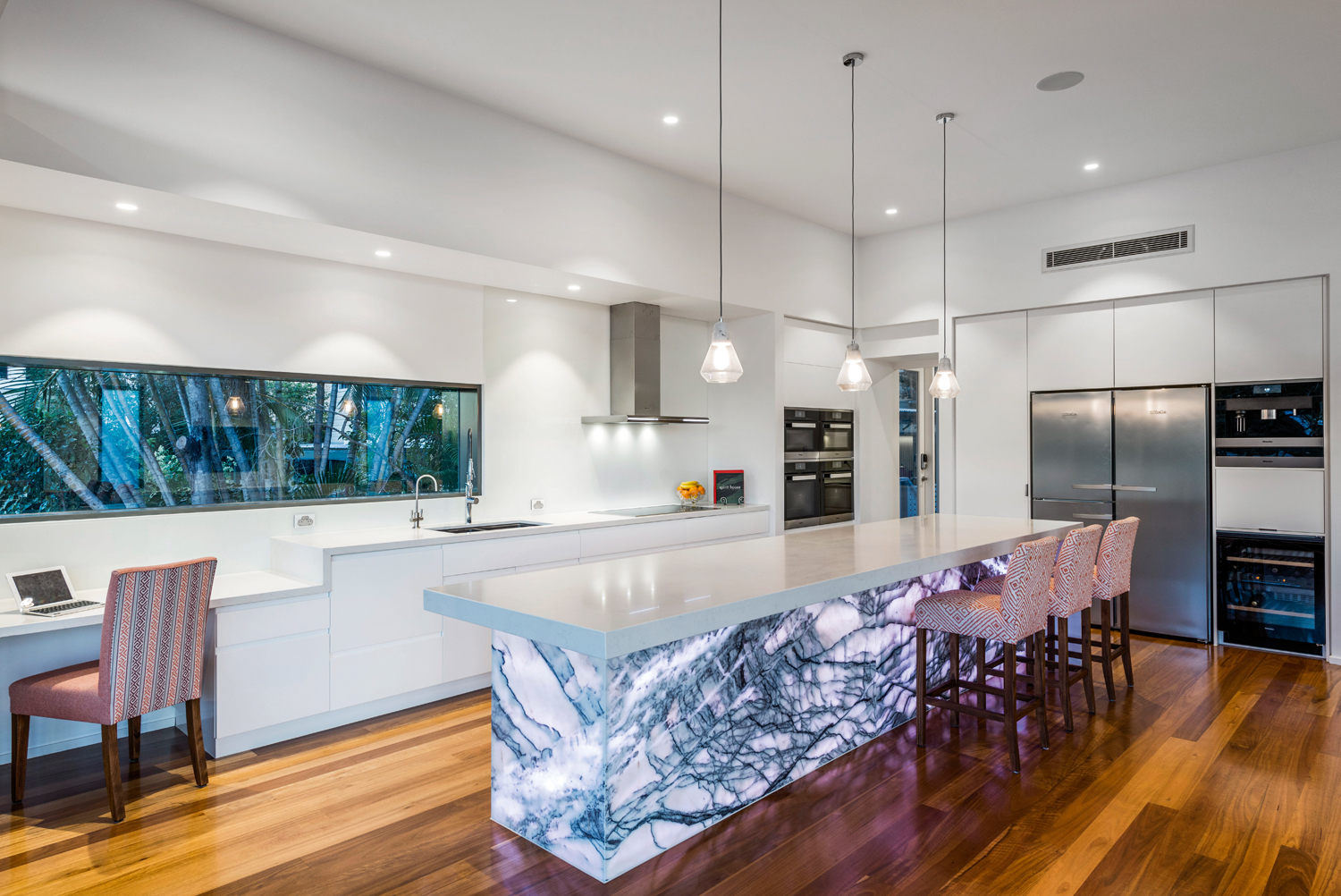 The owners requested a modern minimalist design and included the feature backlit New York marble for its dramatic vein structure and monochromatic colour. The island is beautifully impactful against the understated kitchen and contrasts with the muted colour palette and streamlined finishes.