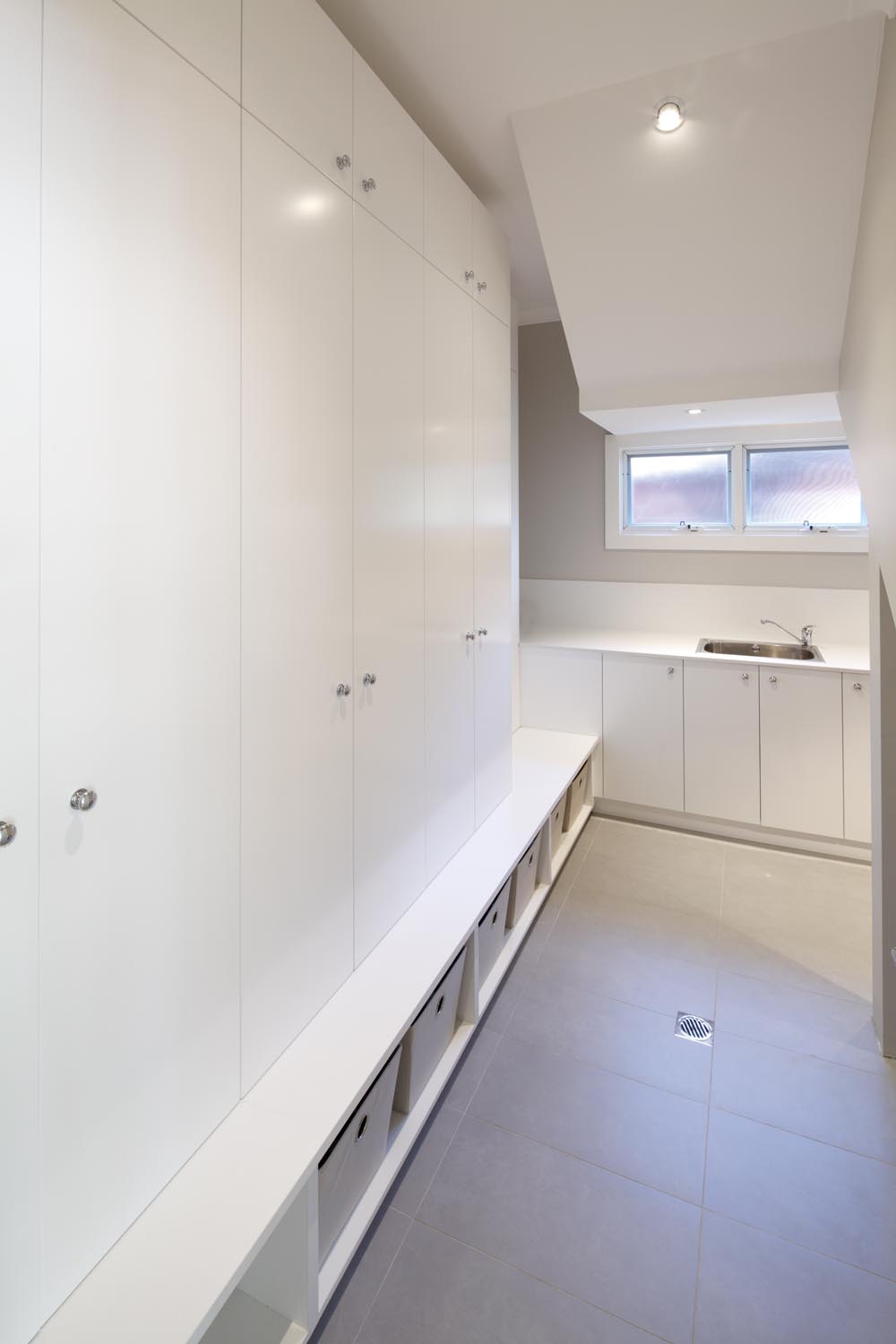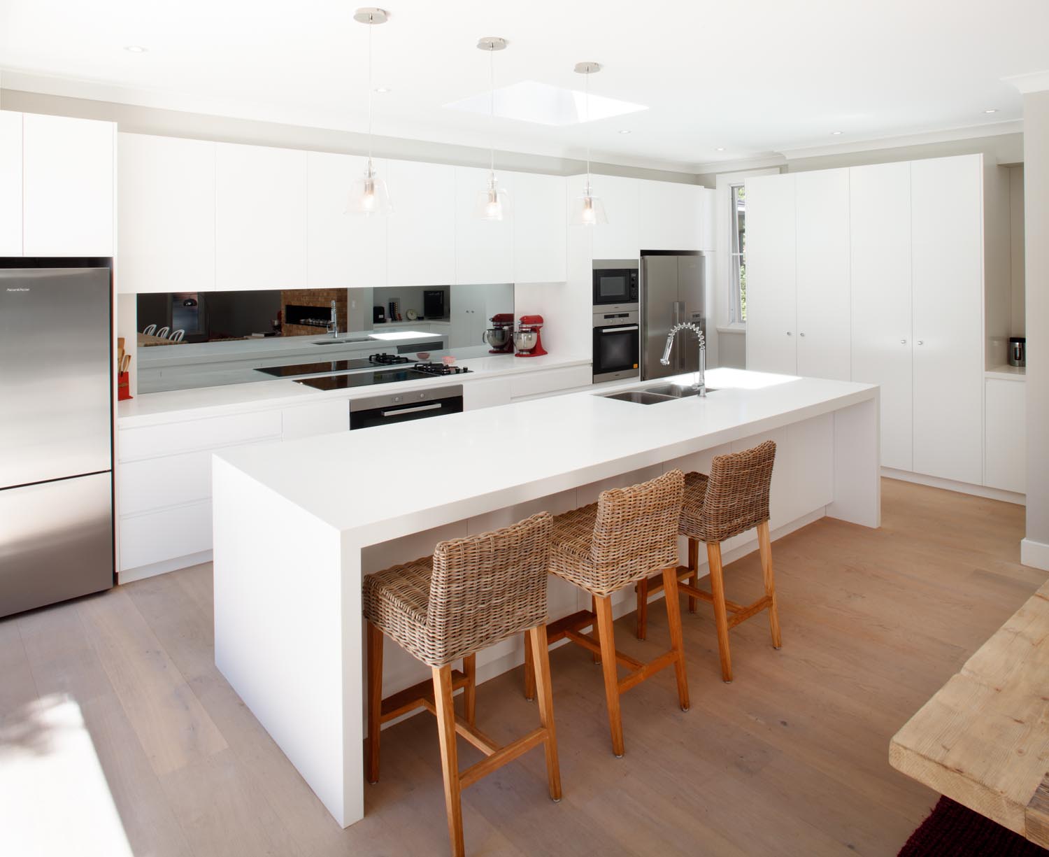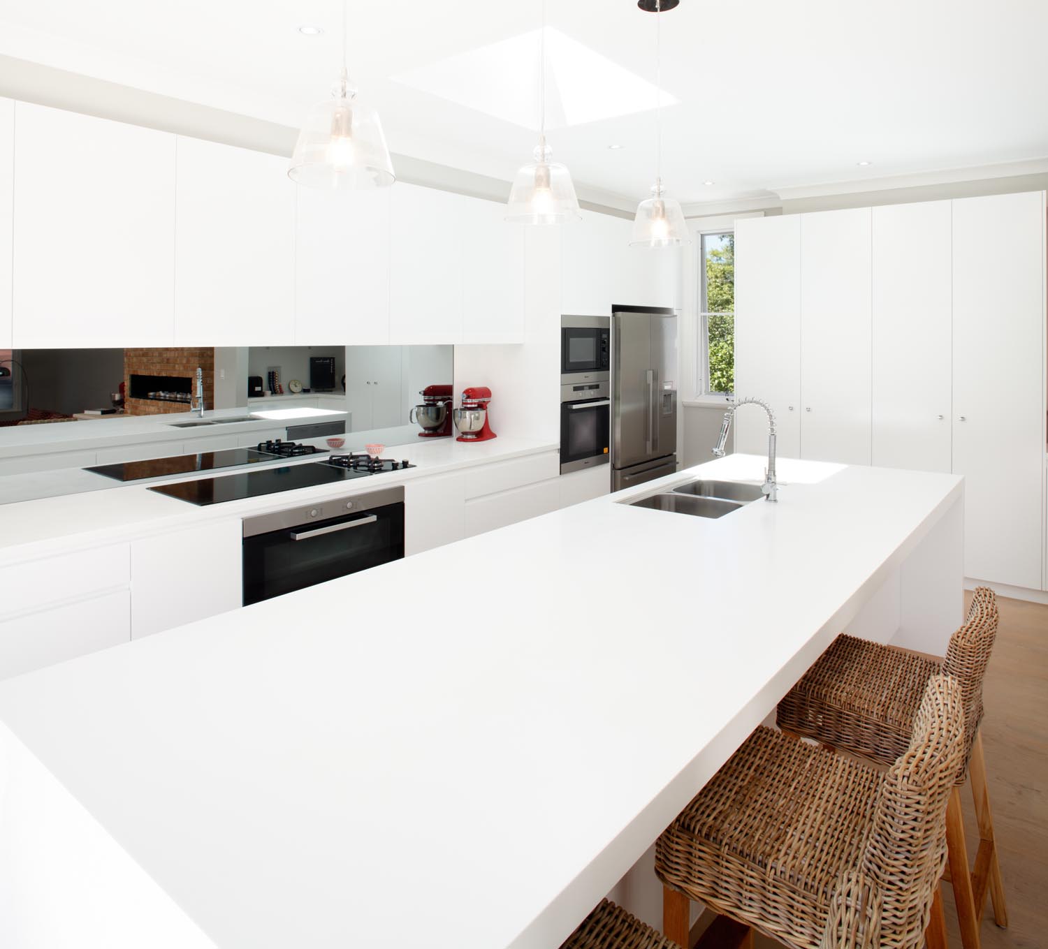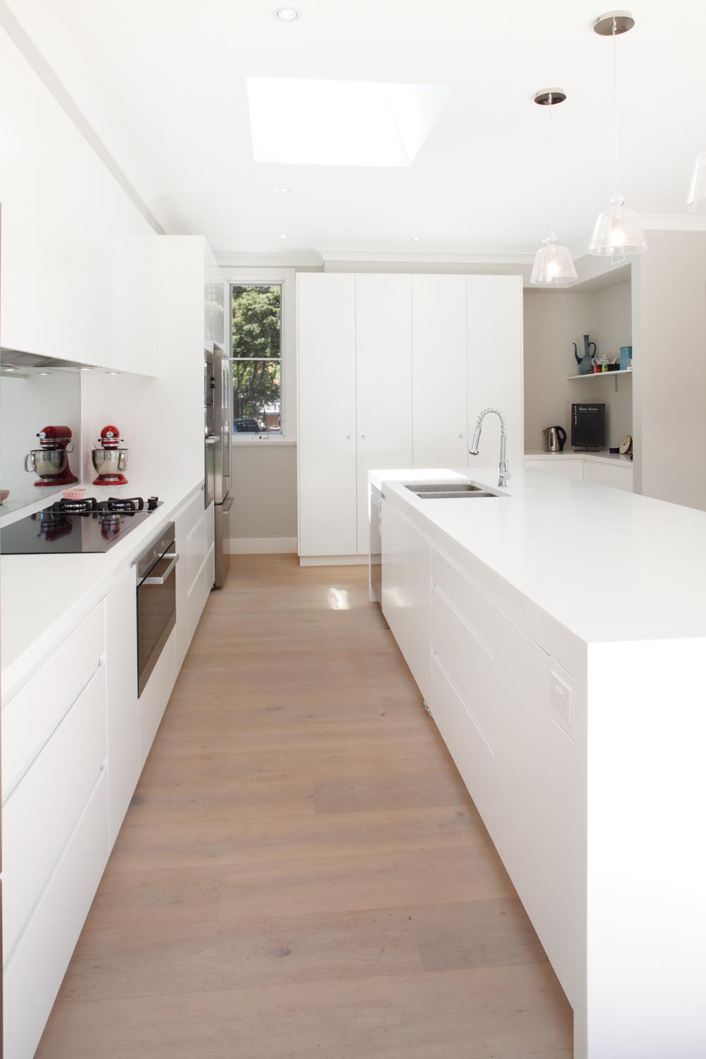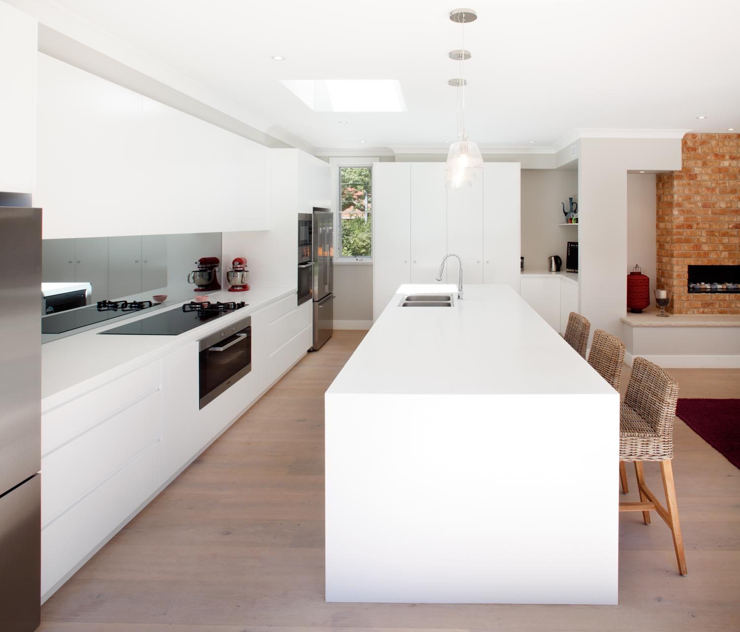 Every element of the project was chosen with family functionality in mind. The 4m long Corian island is the centrepiece, creating a great space for the family to gather. Drawers at varying ergonomic heights enhance the practicality of the room and handle-free cabinetry delivers a sleek form.