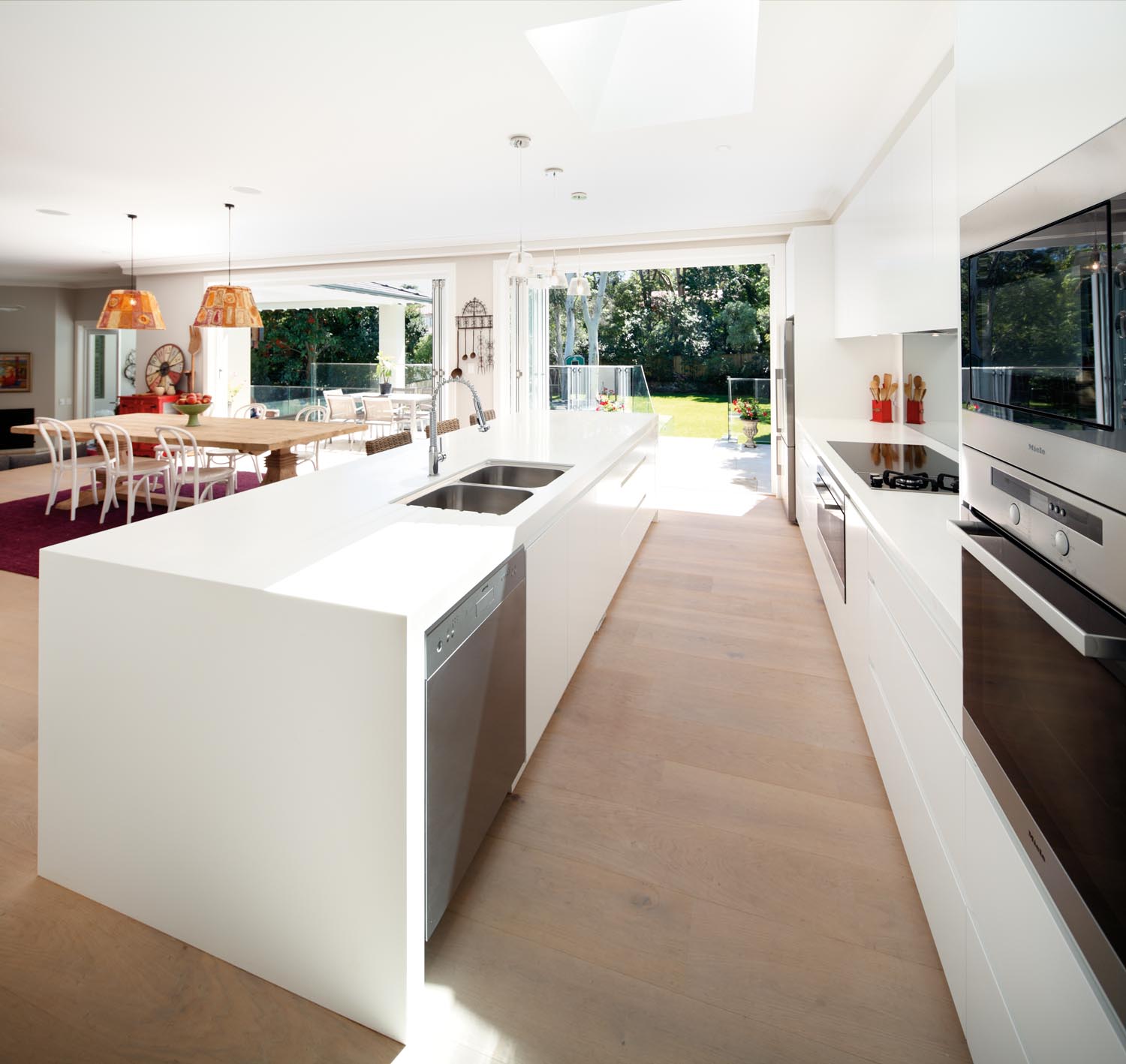 Combining the kitchen, dining and outdoor living areas, this stunning galley-style kitchen is an entertainers dream