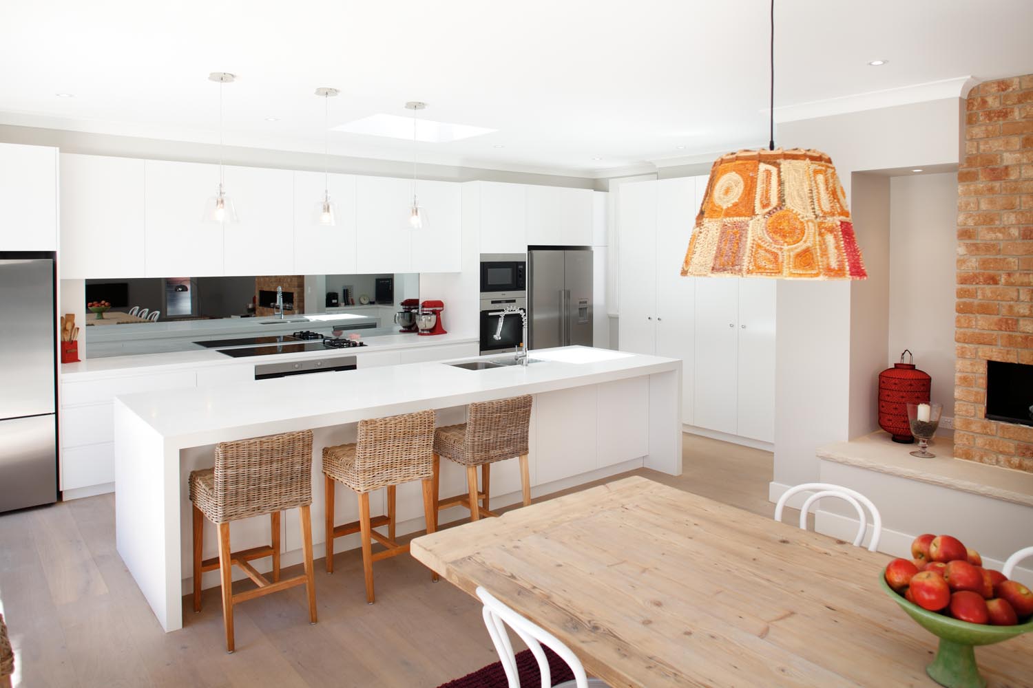 An eclectic mix of old and new adds character and interest; a whitewashed floor and rustic brick fireplace in the dining area balance the vivid white polyurethane cabinetry and stainless-steel appliances.