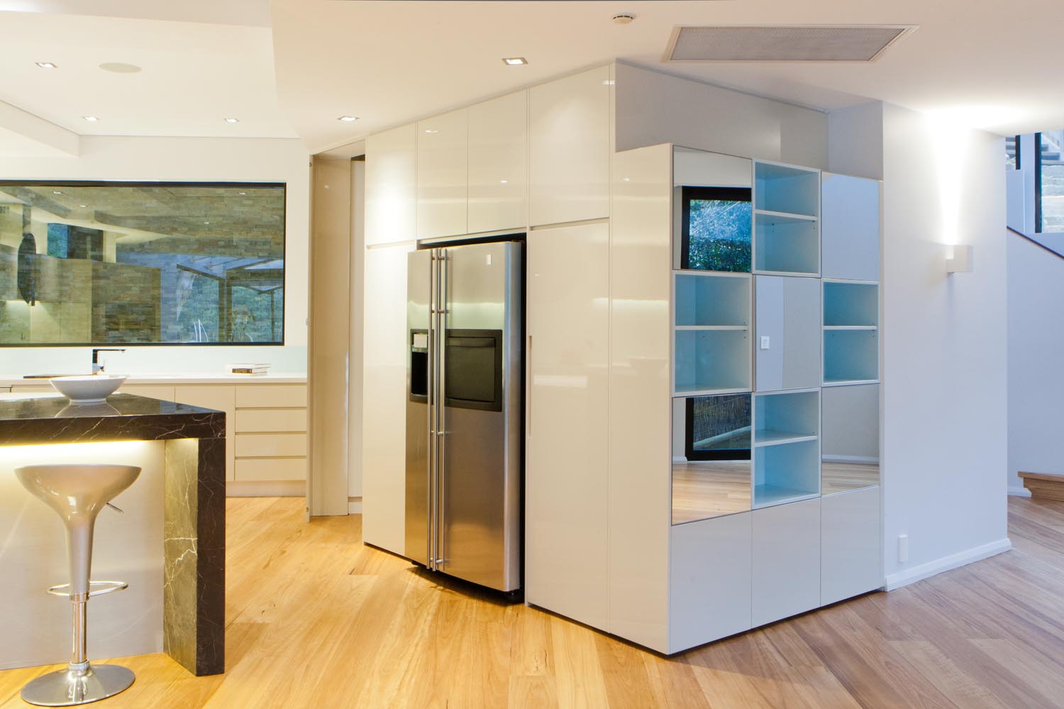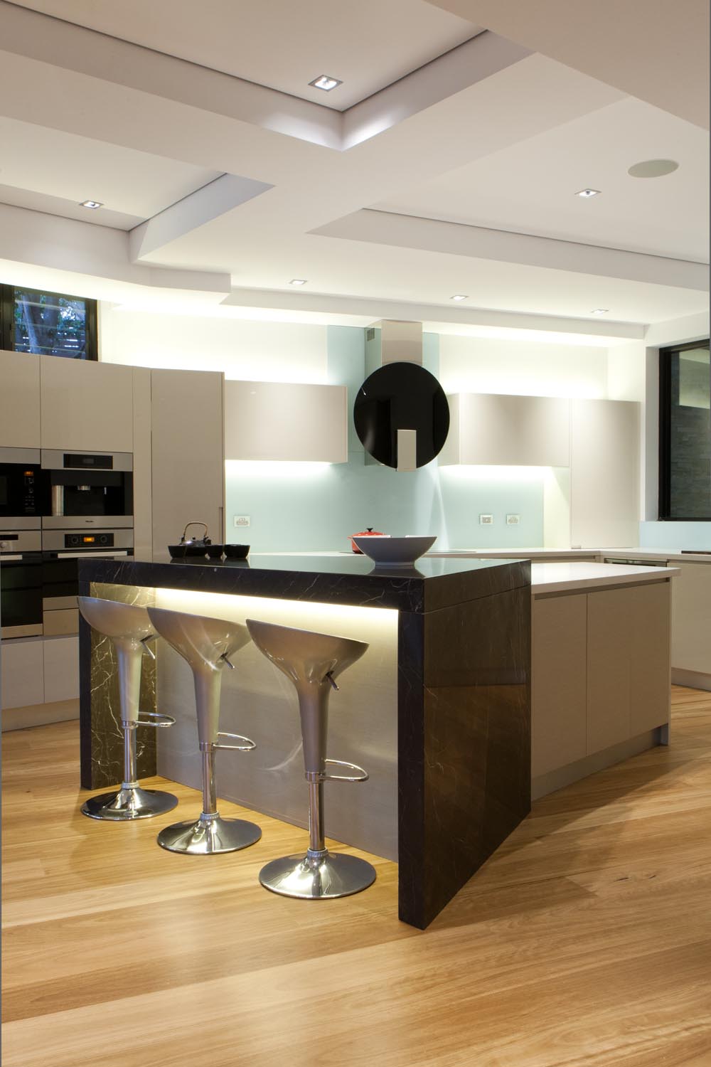 In bold contrast, the Empire Satin marble breakfast bar envelopes the more practical Caesarstone workbench. The owners love to entertain, so we included a massive storage space in a walk-in pantry plus two banks of Miele cooking appliances.”