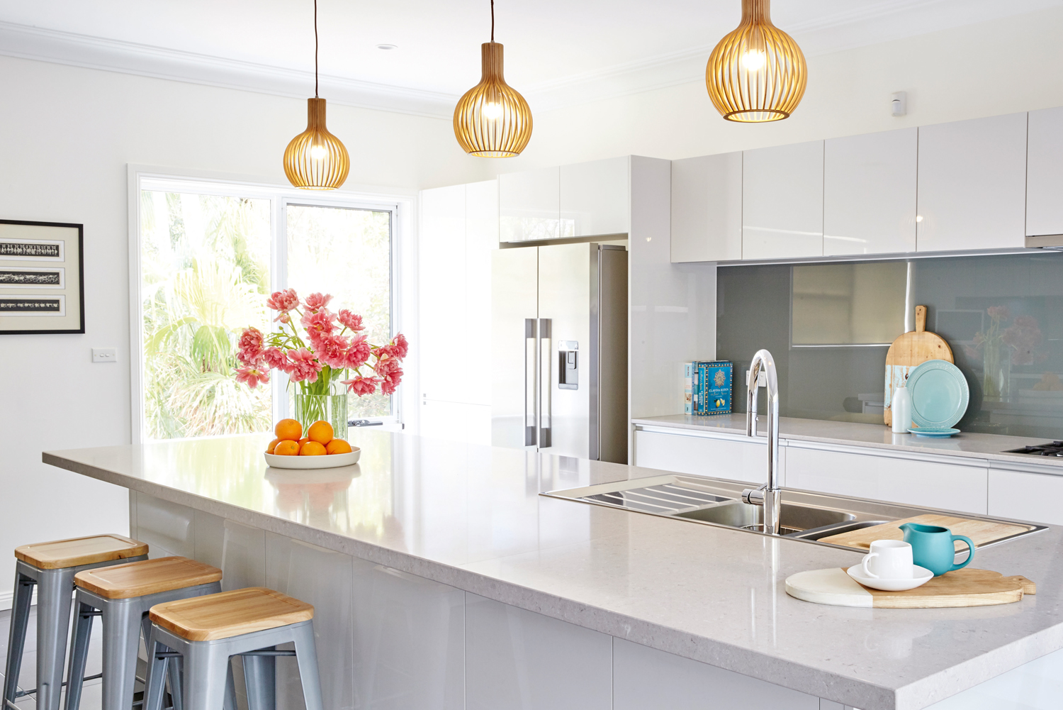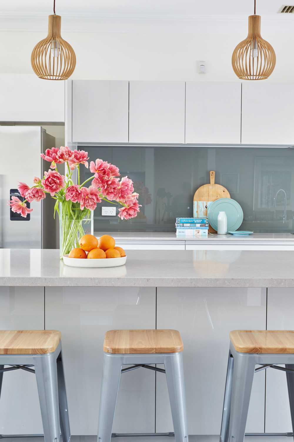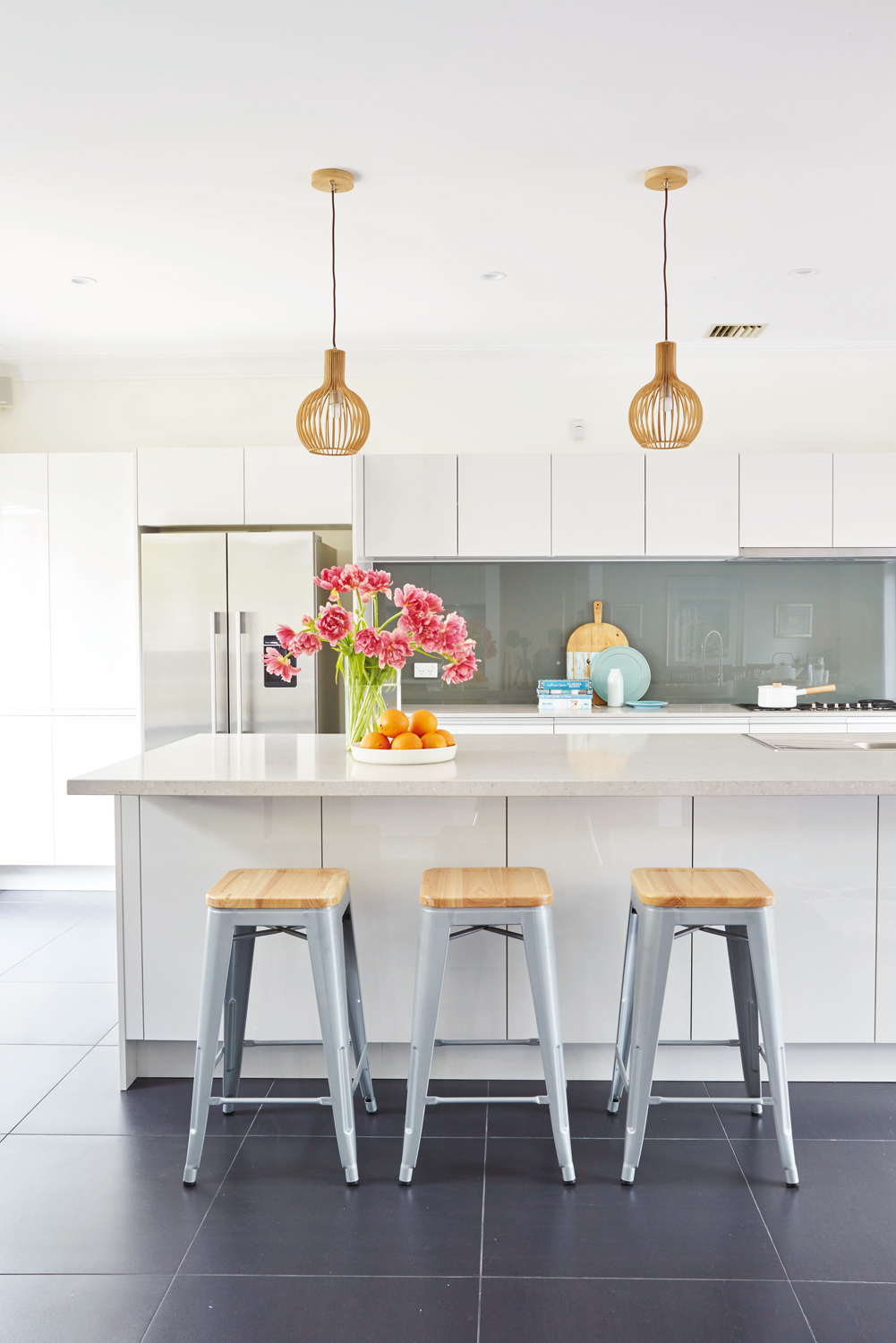 “Originally a small, closed-in space, this gorgeous neutral kitchen has been opened up considerably to create a light-filled, open room perfectly suited to a big household.