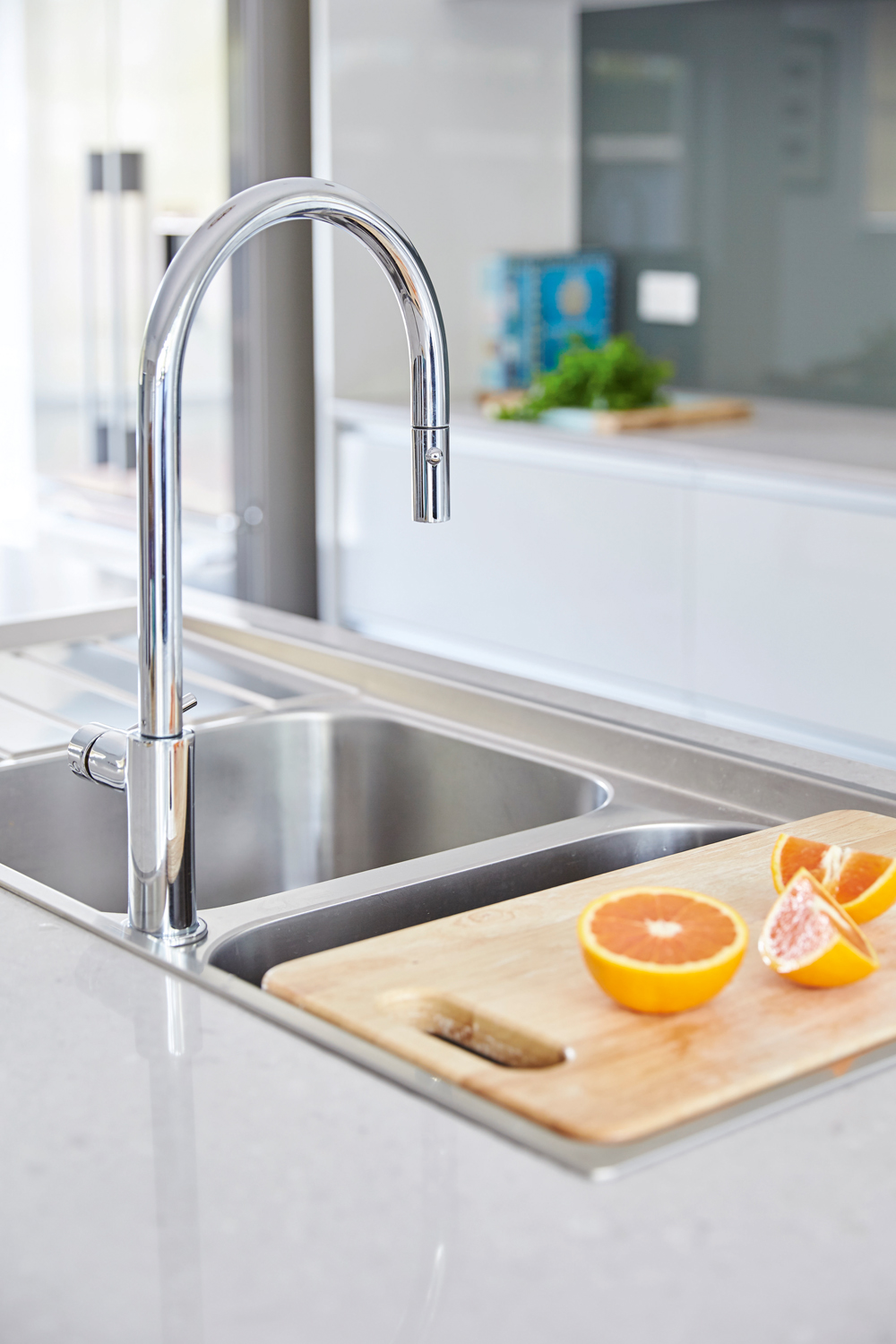 Handy features such as a TV, loads of storage and a huge kitchen island make this a truly multipurpose space – equally well suited to large-scale entertaining and casual family meals. Pops of bright colour and rich texture add interest, while the neutral palette allows for easy updates as trends change.”