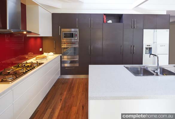 “When the owners of this large Sydney home bought the house some years ago, the cathedral ceiling above the living room was a major attraction, but the space beneath it was in need of rejuvenation. After consulting their architects, the homeowners asked us to design a new kitchen to make better use of the space and to take advantage of the abundance of natural light from above and through the adjacent glass doors to the garden and outdoor entertaining area. My brief was to create a central hub for the family to meet and socialise. More than just a kitchen, it would be a place to have meals, to do homework or just to hang out. Having plenty of storage was essential to minimise clutter, so floor-to-ceiling cabinets were included along with a huge walk-in pantry hidden behind the tall cabinets. The two-tone kitchen defines the room space – tall wall cabinets finished in Laminex Espresso and floor cabinets and an island bench finished in Whisper White polyurethane – while the Zoom Red glass splashback provides a dramatic contrast. The mitred essastone benchtop in New Basmati on all surfaces adds an elegant and functional feature. The result is a family-friendly space perfectly suited to both everyday living and sophisticated entertaining.”