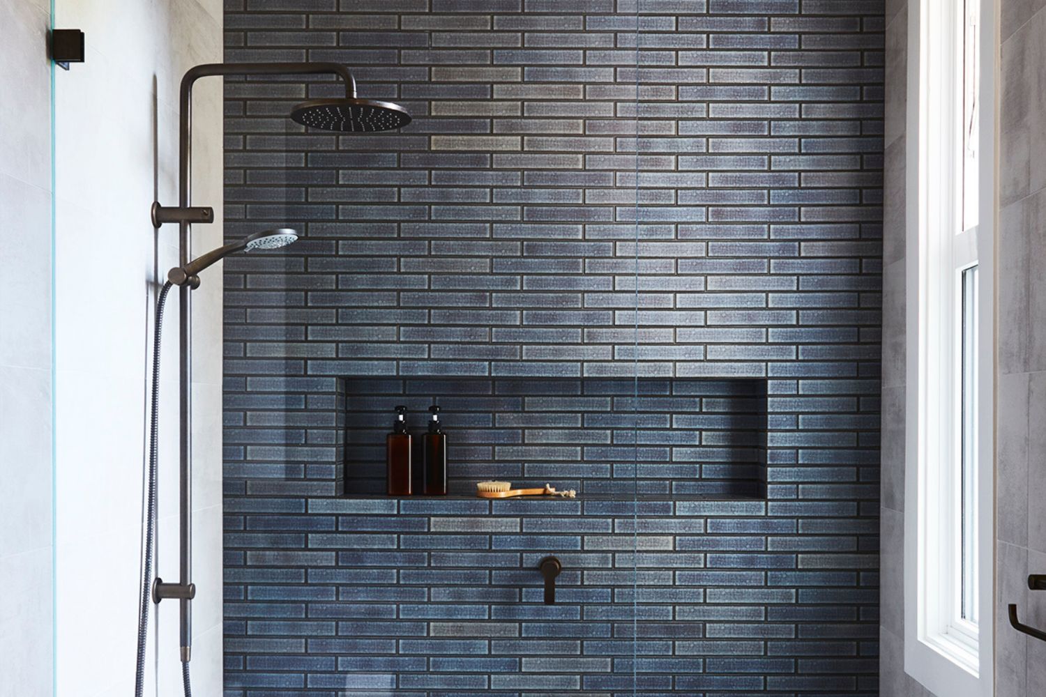 In the bathroom, the tiles that you use are important – opt for textured tiles to reduce slip hazards. Larger-format tiles are also good options, according to Helle, as with larger tiles there’s less grout. She also advises using a gloss or semi-gloss finish as matt tiles are very hard to keep clean.