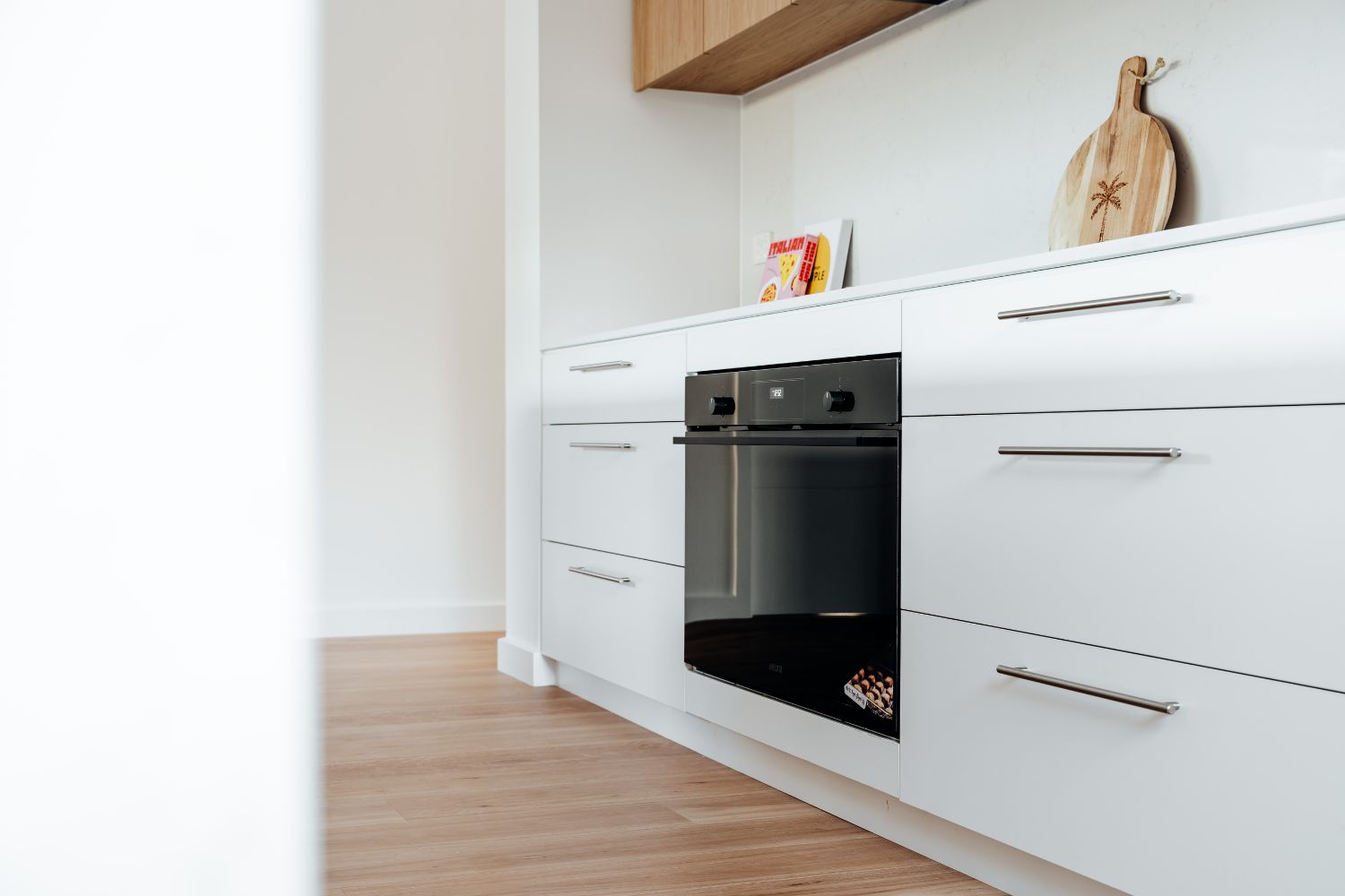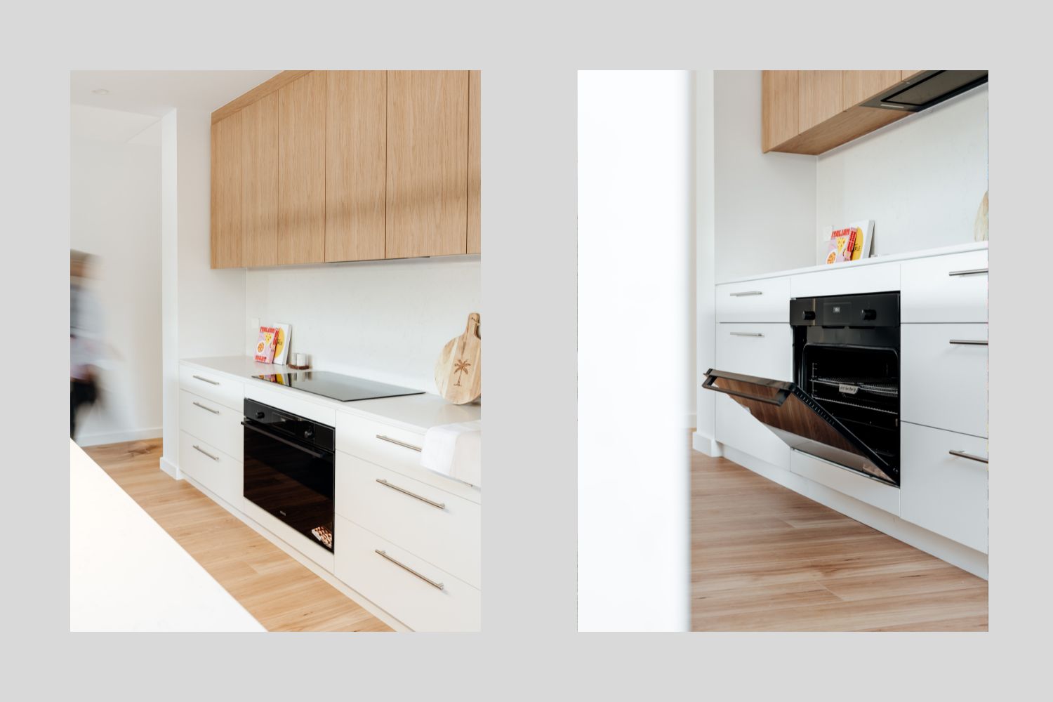 At the heart of the home is a beautiful, contemporary kitchen and entertaining space. The design brief emphasised simplicity whilst creating an inviting ambiance. To achieve this, a light yellow-brown wood with reddish undertones and occasional messmate detailing was chosen for the cabinetry, adding warmth and character. To reduce the colour repetition and maintain a lighter aesthetic, glossy white lower cabinetry and benchtops, complimented by silver handles add a stylish yet subtle touch.
