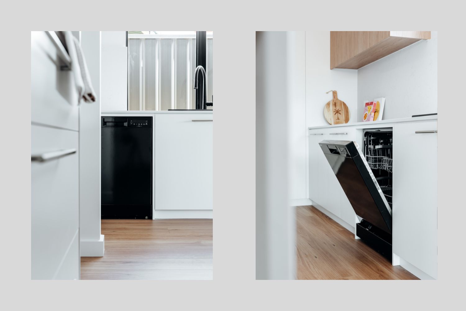 Seamlessly integrated into the cabinetry, the glass undermounted rangehood enhances the modern, streamlined look of the kitchen. Completing the space is the freestanding dishwasher, with an impressive 4.5 star water rating and 3 star energy rating, making it the perfect addition to any household.