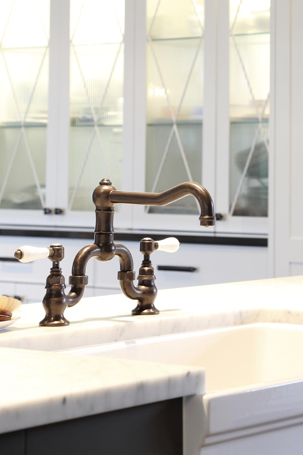 The client was keen to introduce the diamond pattern somewhere, so that the kitchen would have an original element going back to years gone by when attention to detail and decorative features were standard. We’ve kept it subtle by using it on just the upper glass doors and below the casual seating booth.