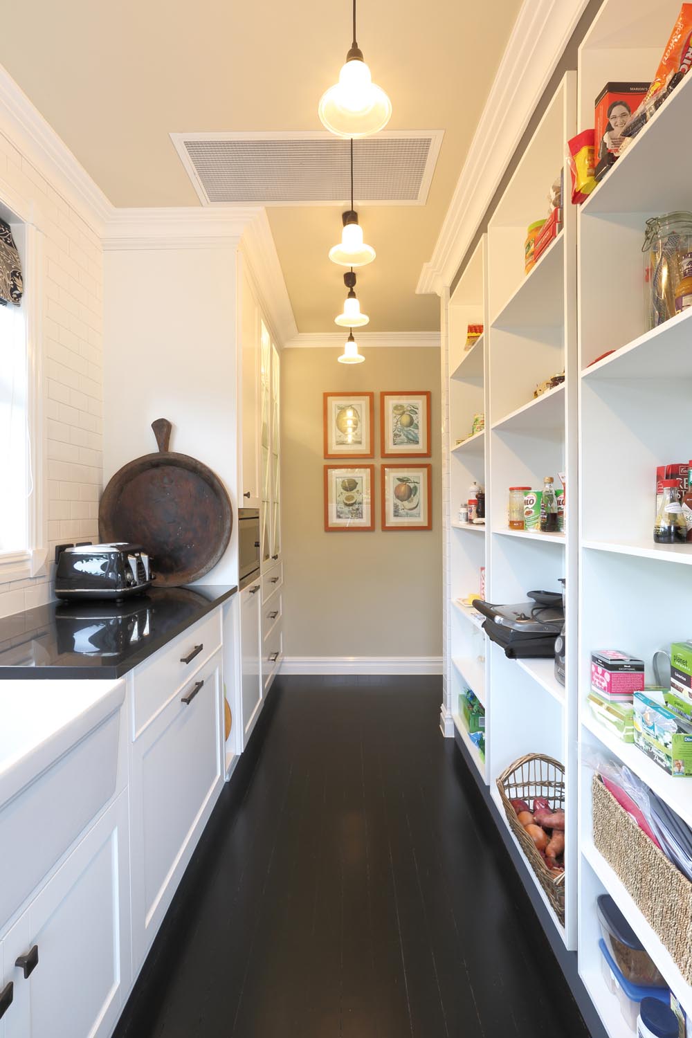 Integrating modern stainless-steel appliances such as the double-door fridge as well as a bar fridge under the island was crucial to creating an authentic-looking older-style kitchen. The cooking area with vintage-style stove and brick-tiled splash back is the focal point of the kitchen while behind that wall we have hidden a pantry with shallow open shelving and scullery.