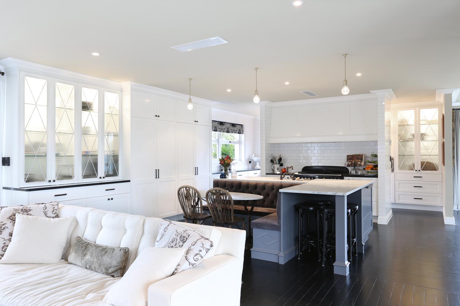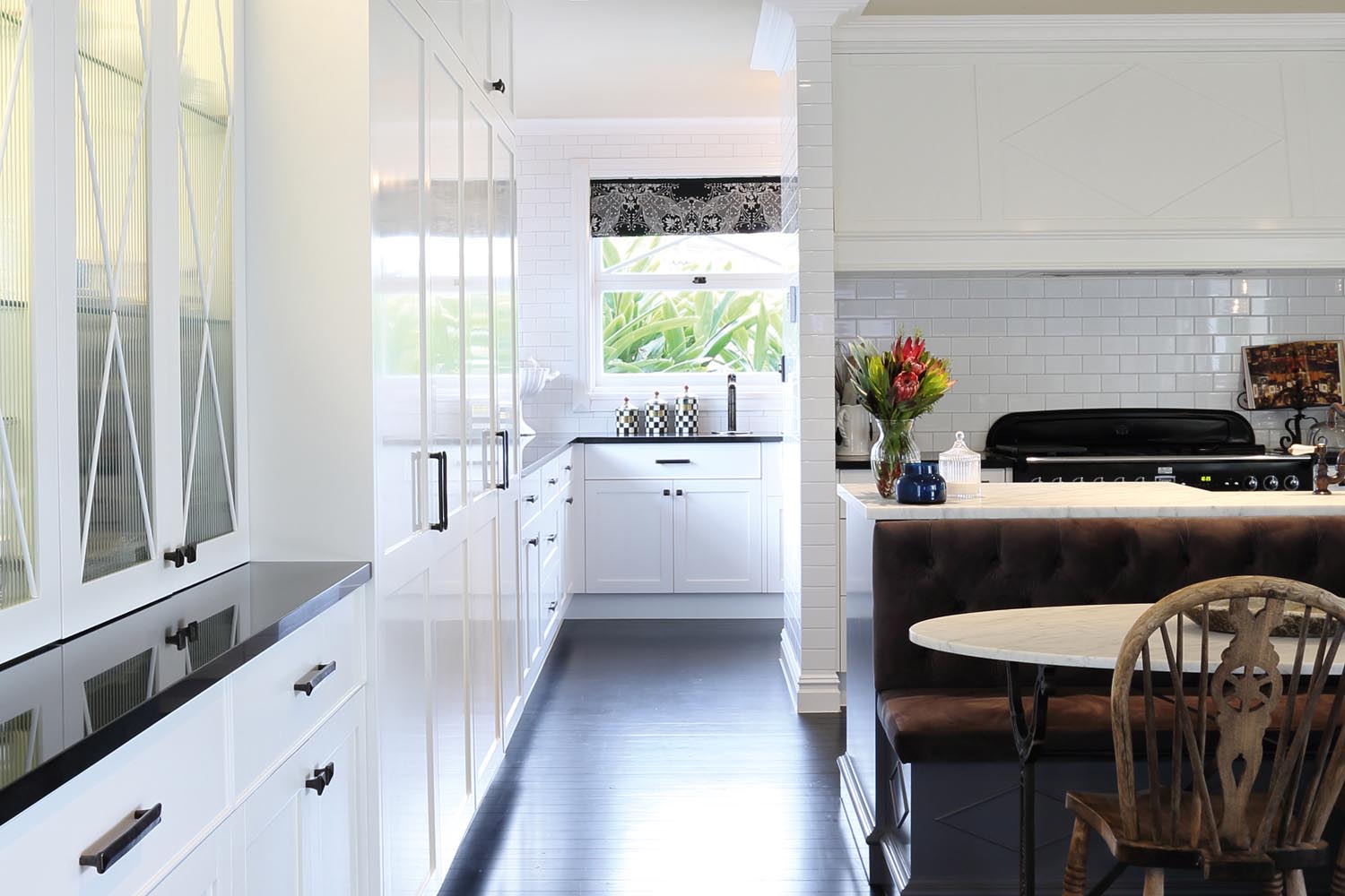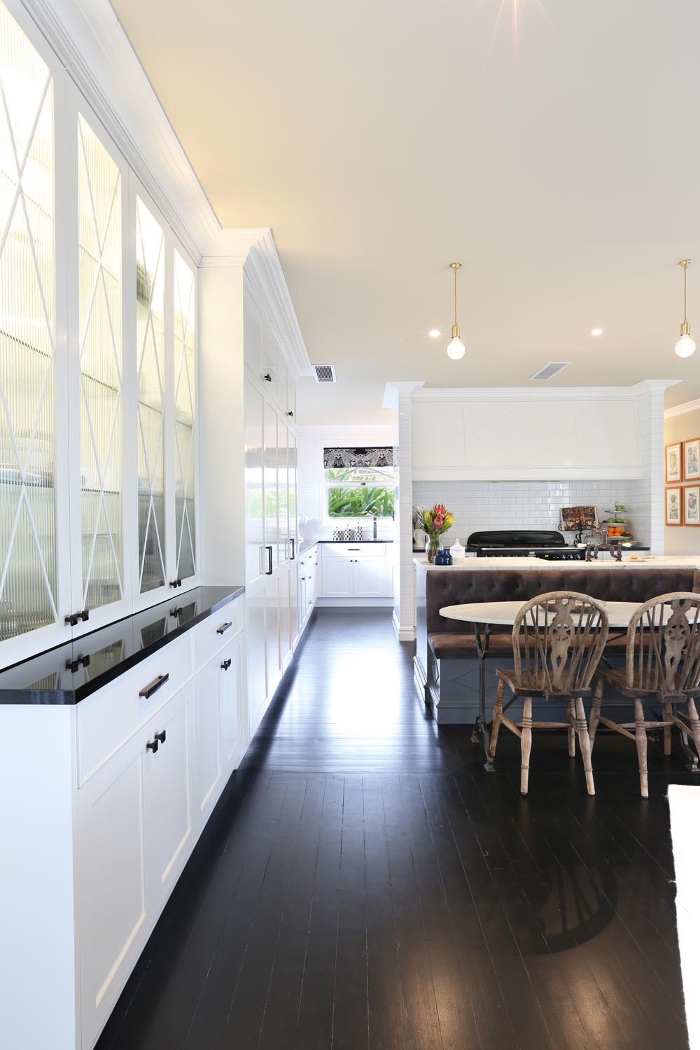 “This kitchen renovation is in a three-storey mansion on acreage which has a very grand old American feel to it. This style is continued in the kitchen, which also has Georgian elements such as the detail in the mouldings and an Art Deco black and white colour scheme with Shaker-style doors.