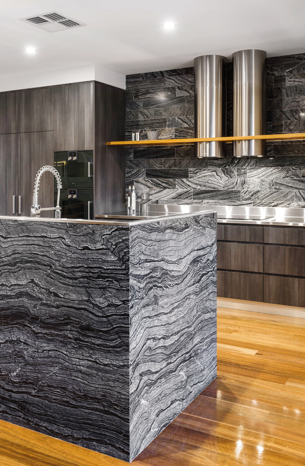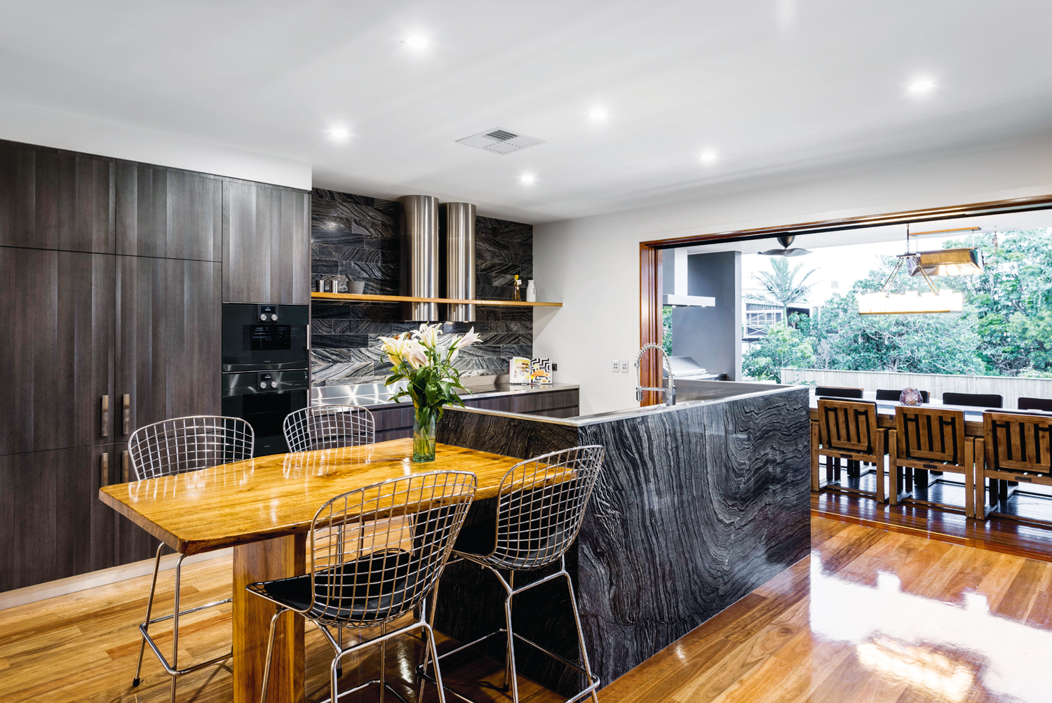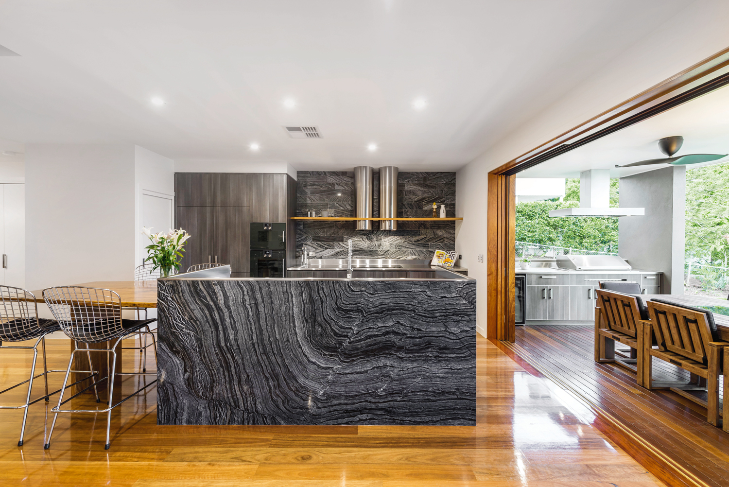 “Proving that family-friendly doesn’t have to be understated, this lush kitchen is equal parts stylish and practical. The eye is instantly drawn to the dramatic island bench, with a mix of marble, timber and stainless steel creating an elegant look with an industrial twist.