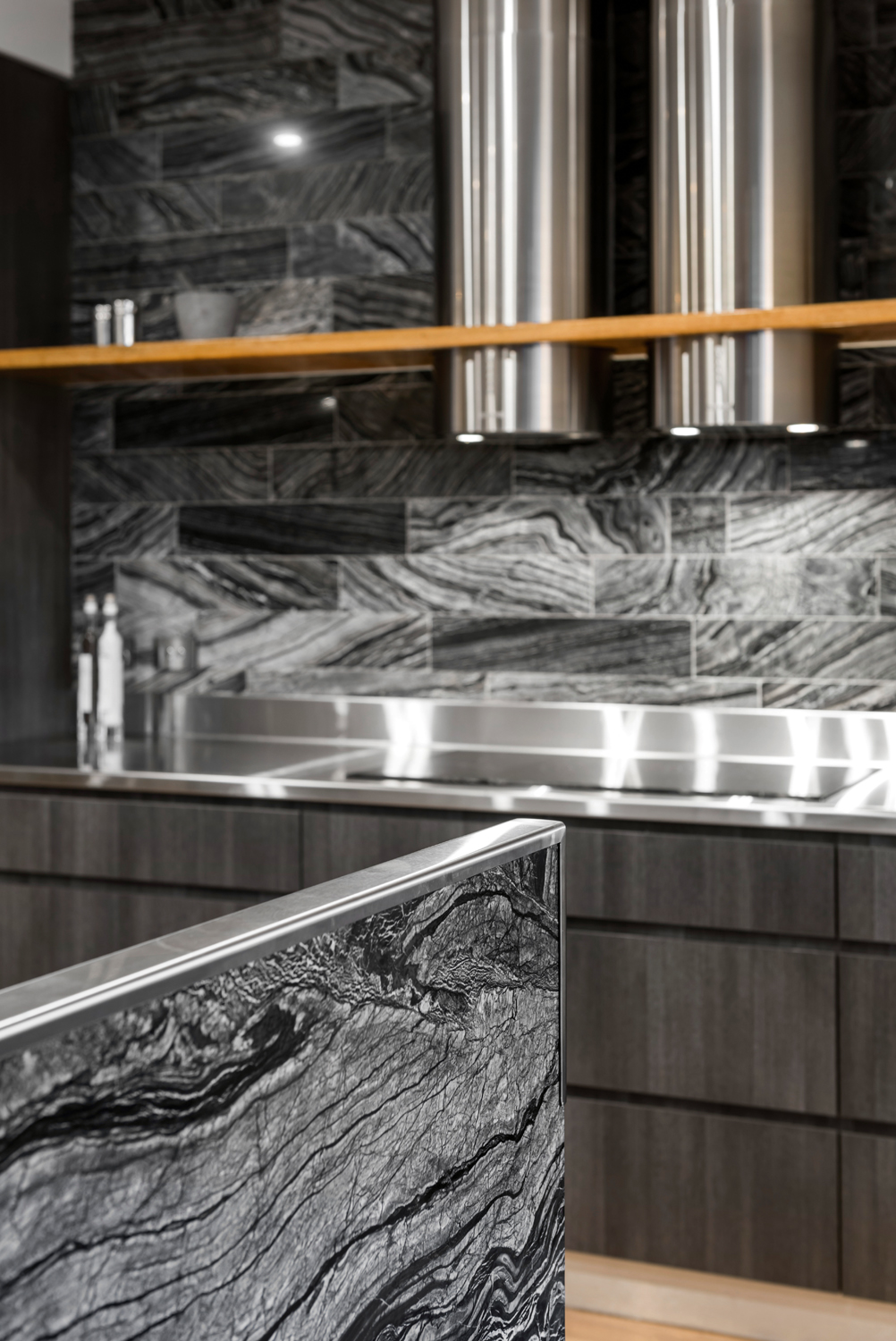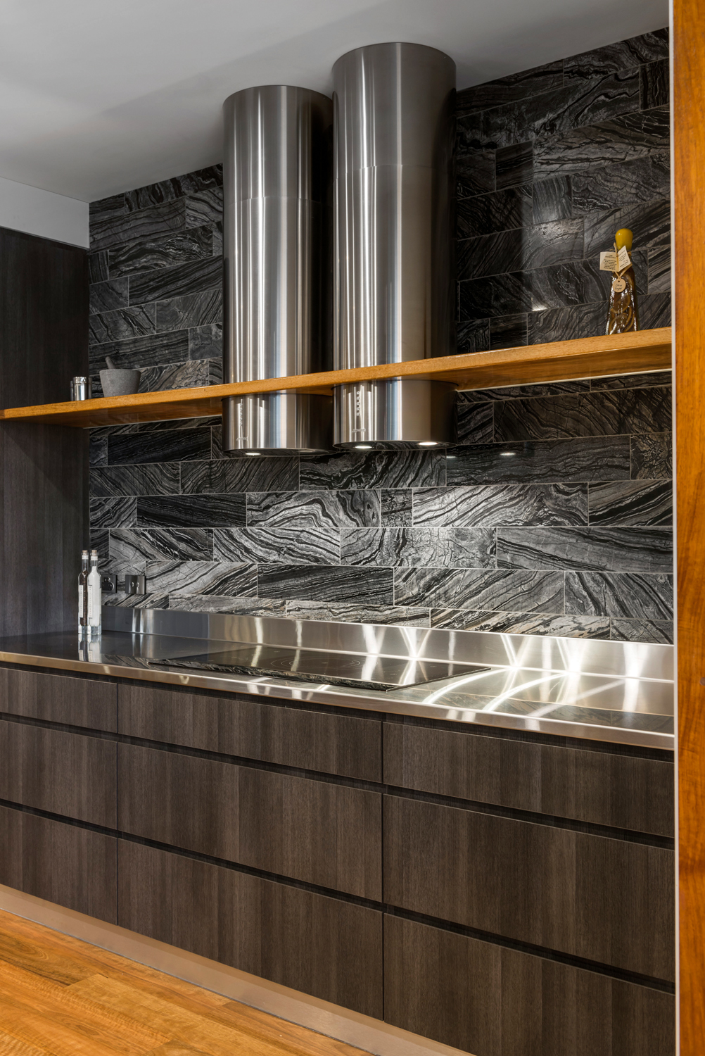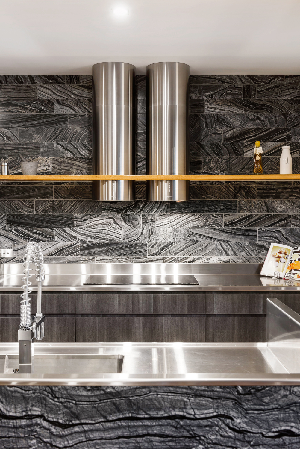“Proving that family-friendly doesn’t have to be understated, this lush kitchen is equal parts stylish and practical. The eye is instantly drawn to the dramatic island bench, with a mix of marble, timber and stainless steel creating an elegant look with an industrial twist.