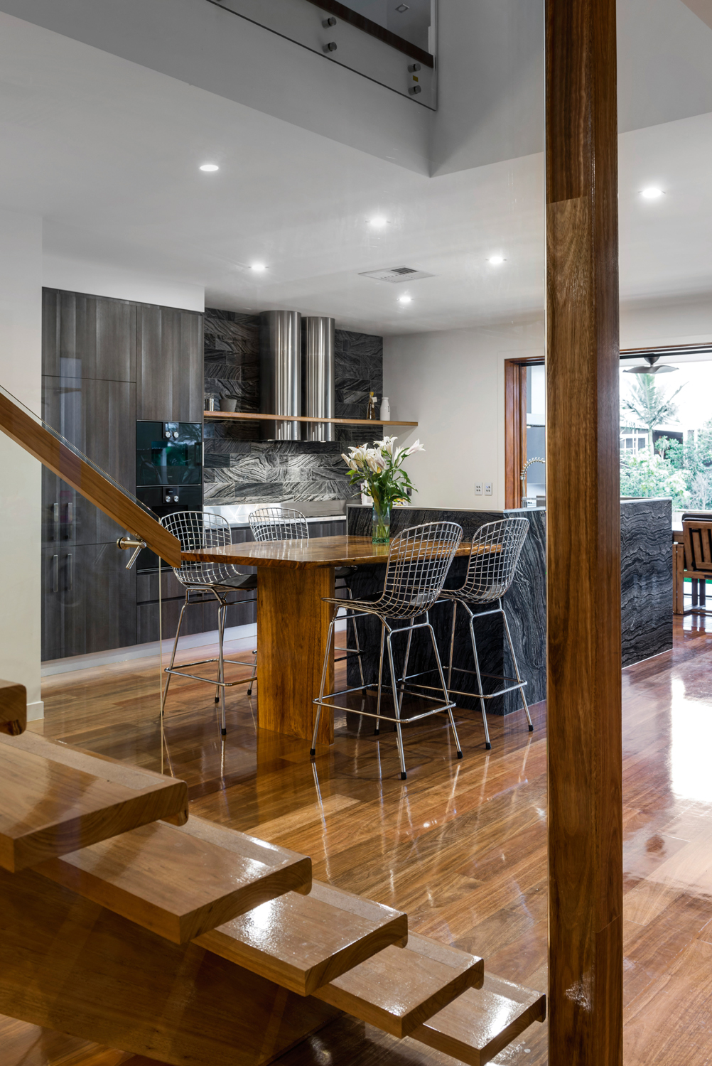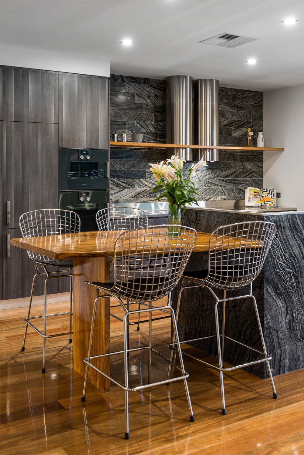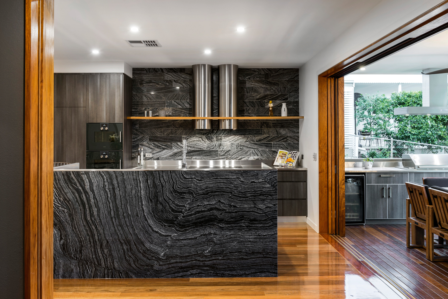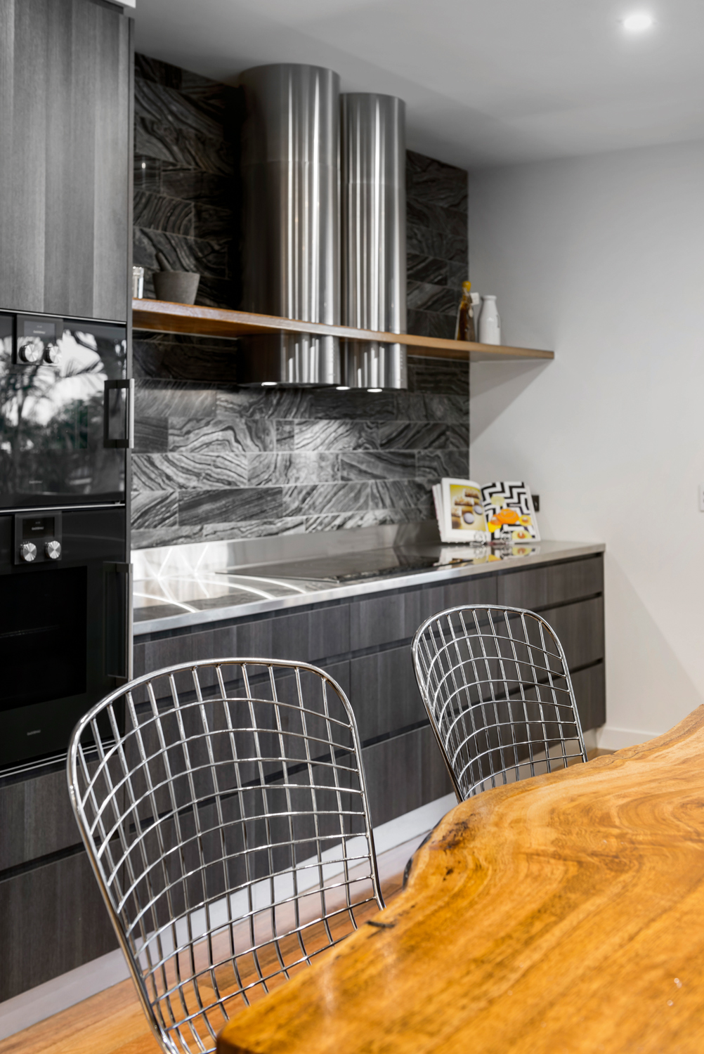 The proximity to the outdoor entertaining area cleverly brings the outside in, flooding the room with natural light and creating a sense of airiness and vibrancy. Matte black appliances reaffirm the element of modish sophistication, only being upstaged by the unique design of the tubular Smeg rangehood.