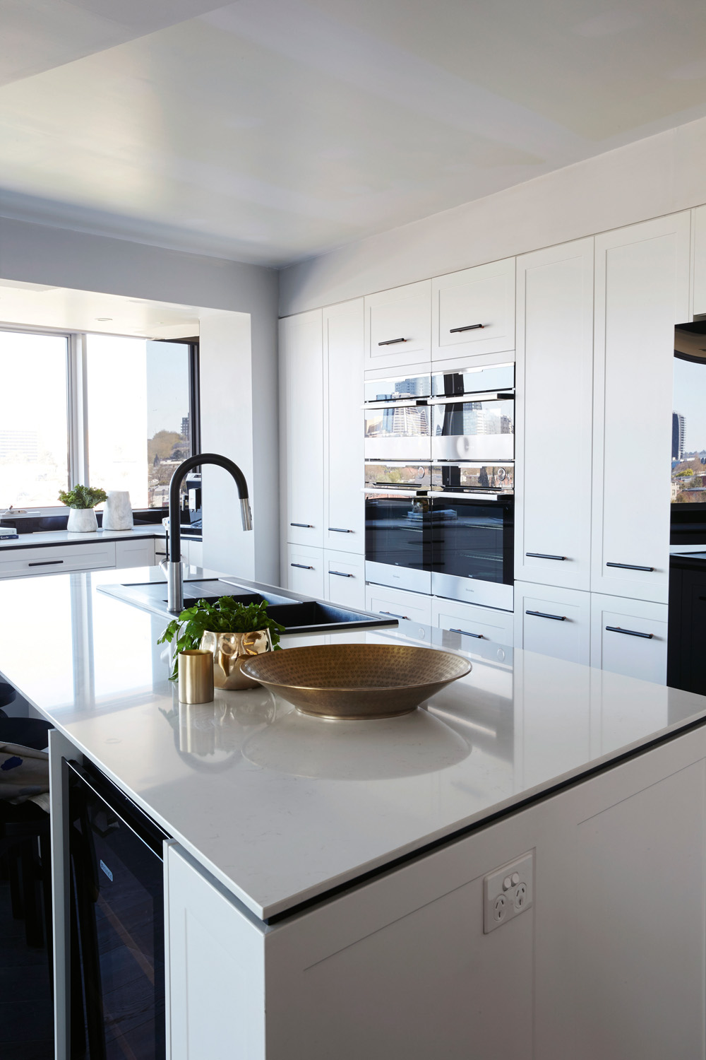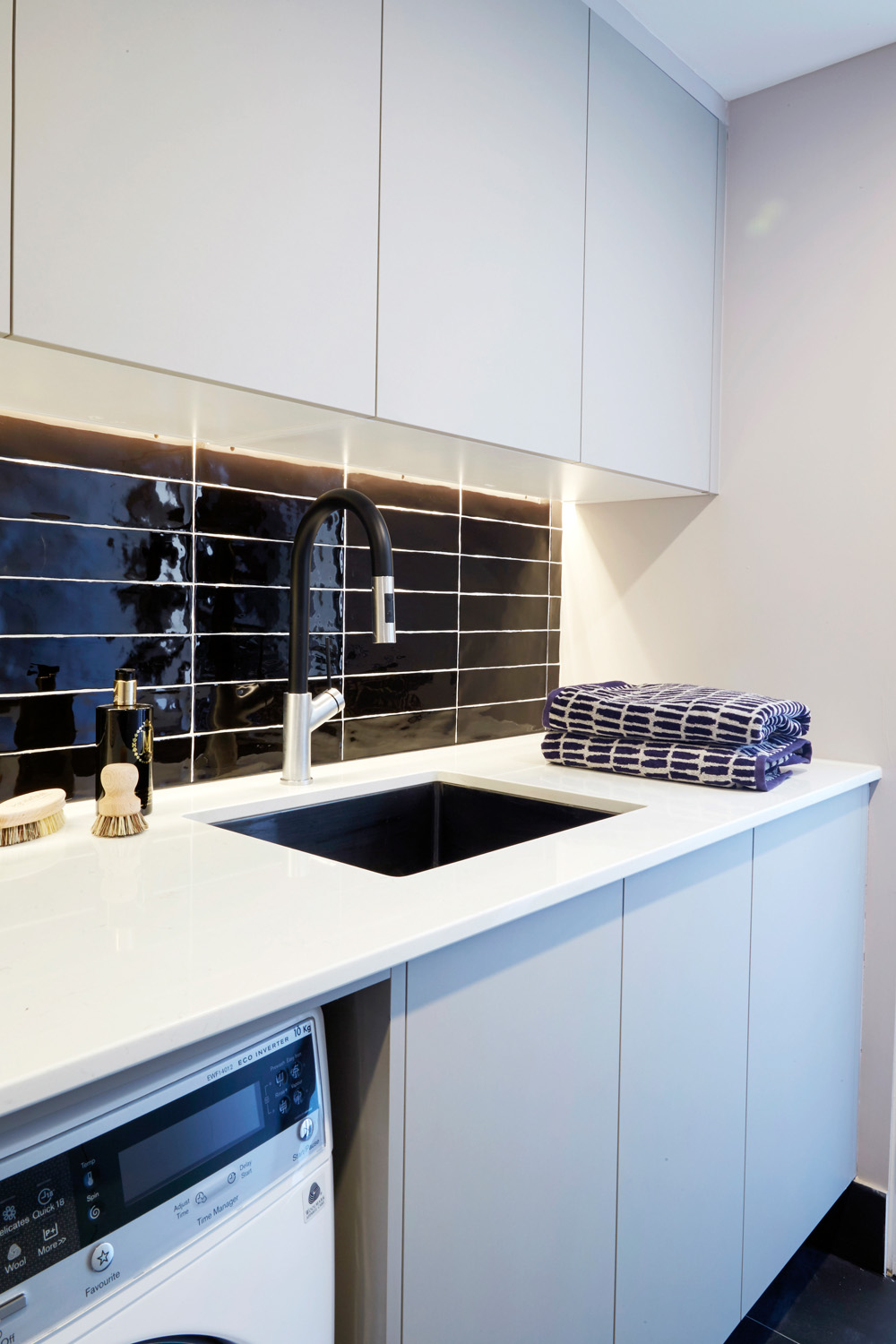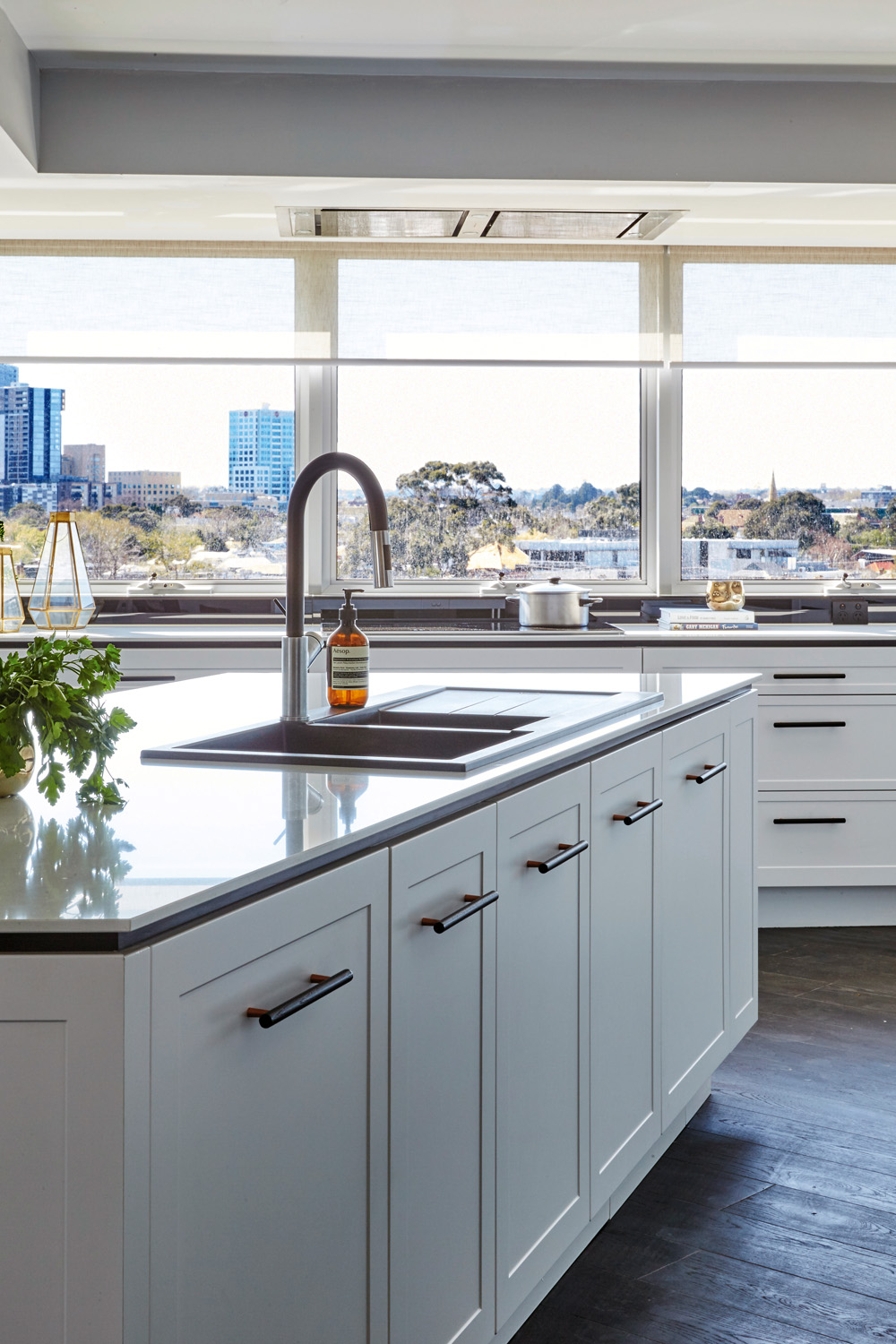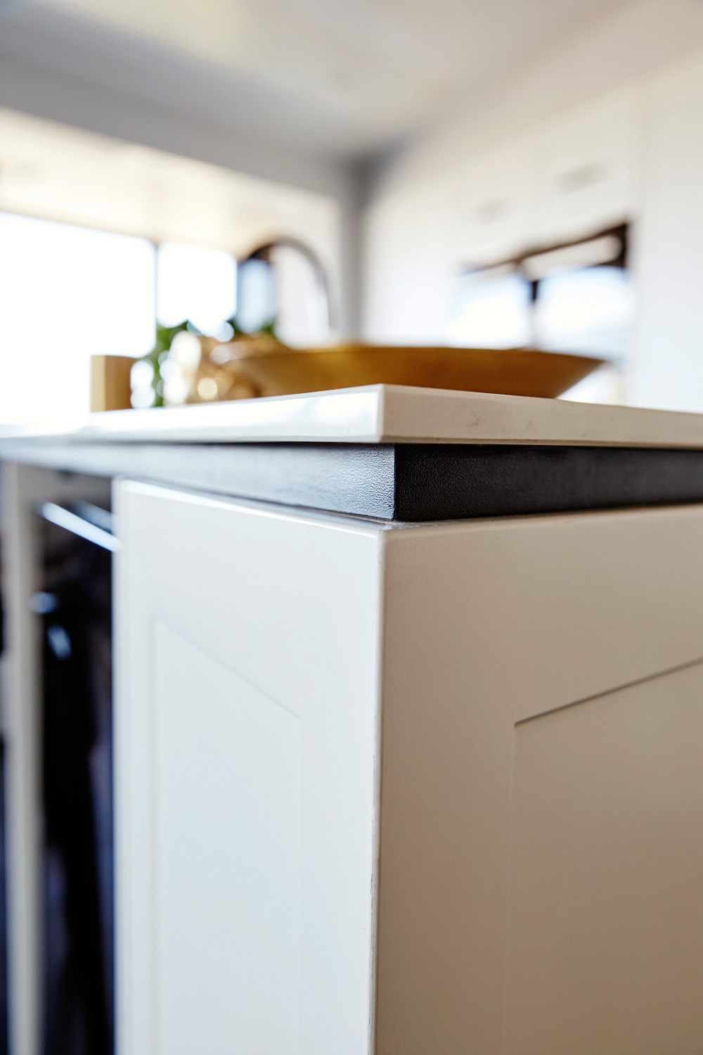 Removing a wall allowed them to open their kitchen space, achieving a great sense of flow to the connecting dining, living and laundry areas. They paired classic white Shaker profile doors with contrasting shadowline detail. The new-style black timber and copper handles add a sense of cohesion and sophistication. The Silestone benchtops in Ariel are cleverly angled to complement the shape of the room, completing this calm and tranquil space.