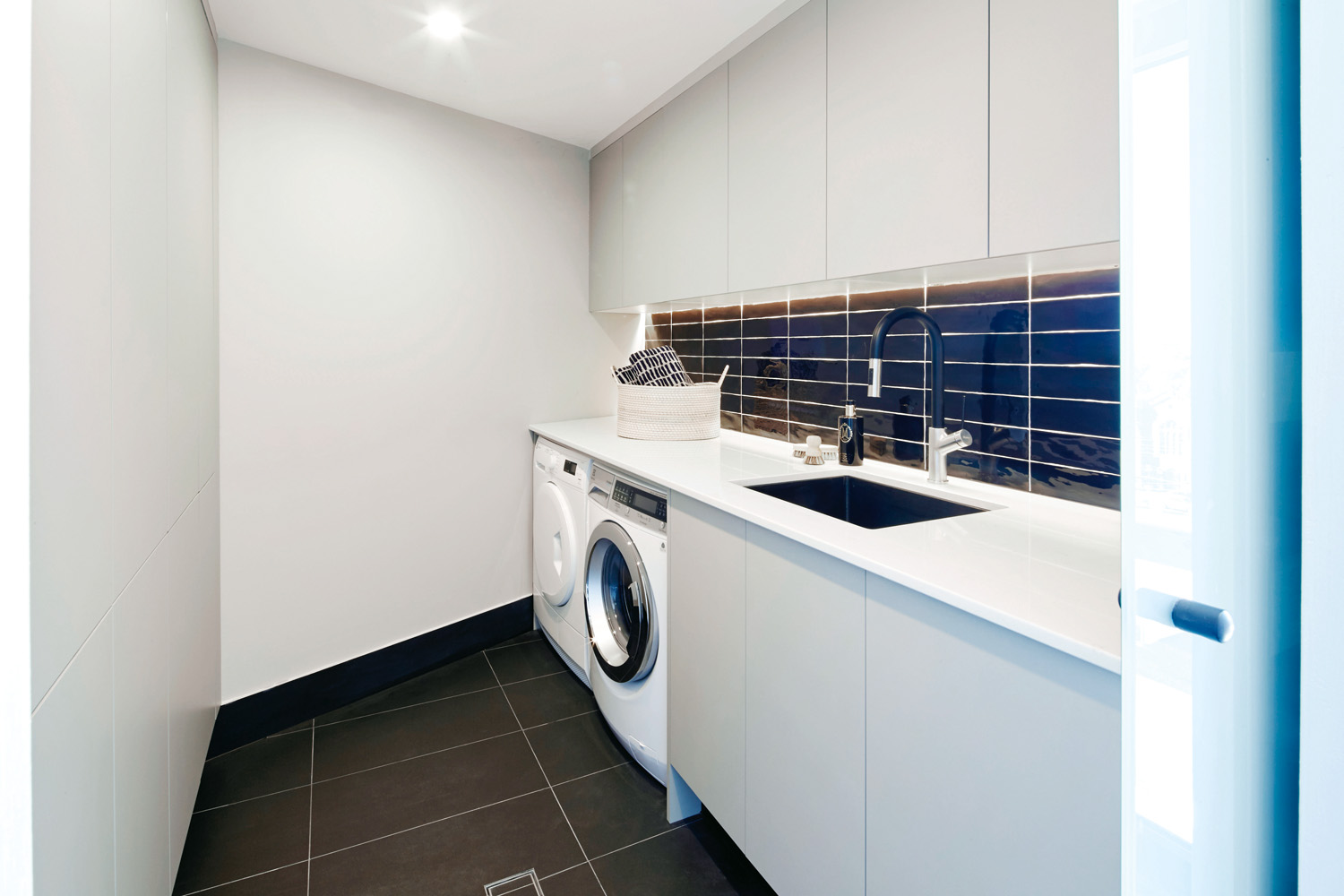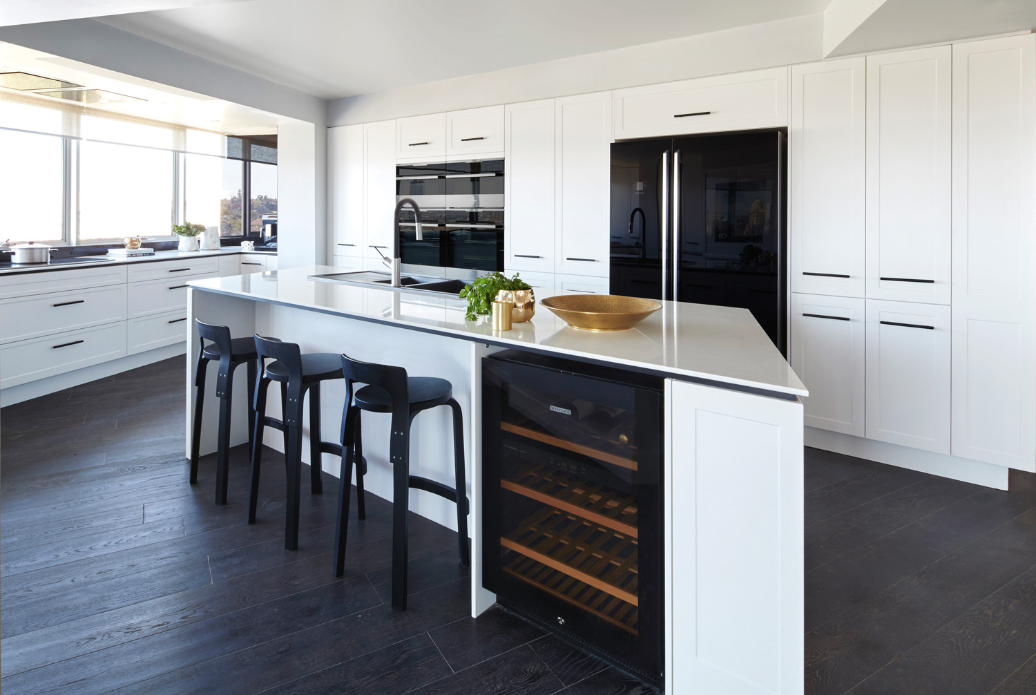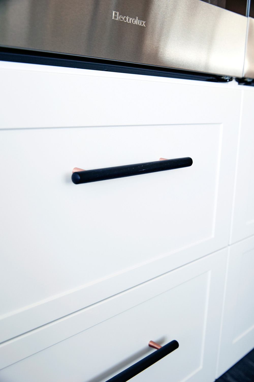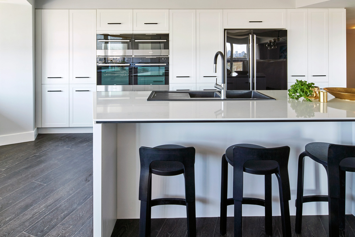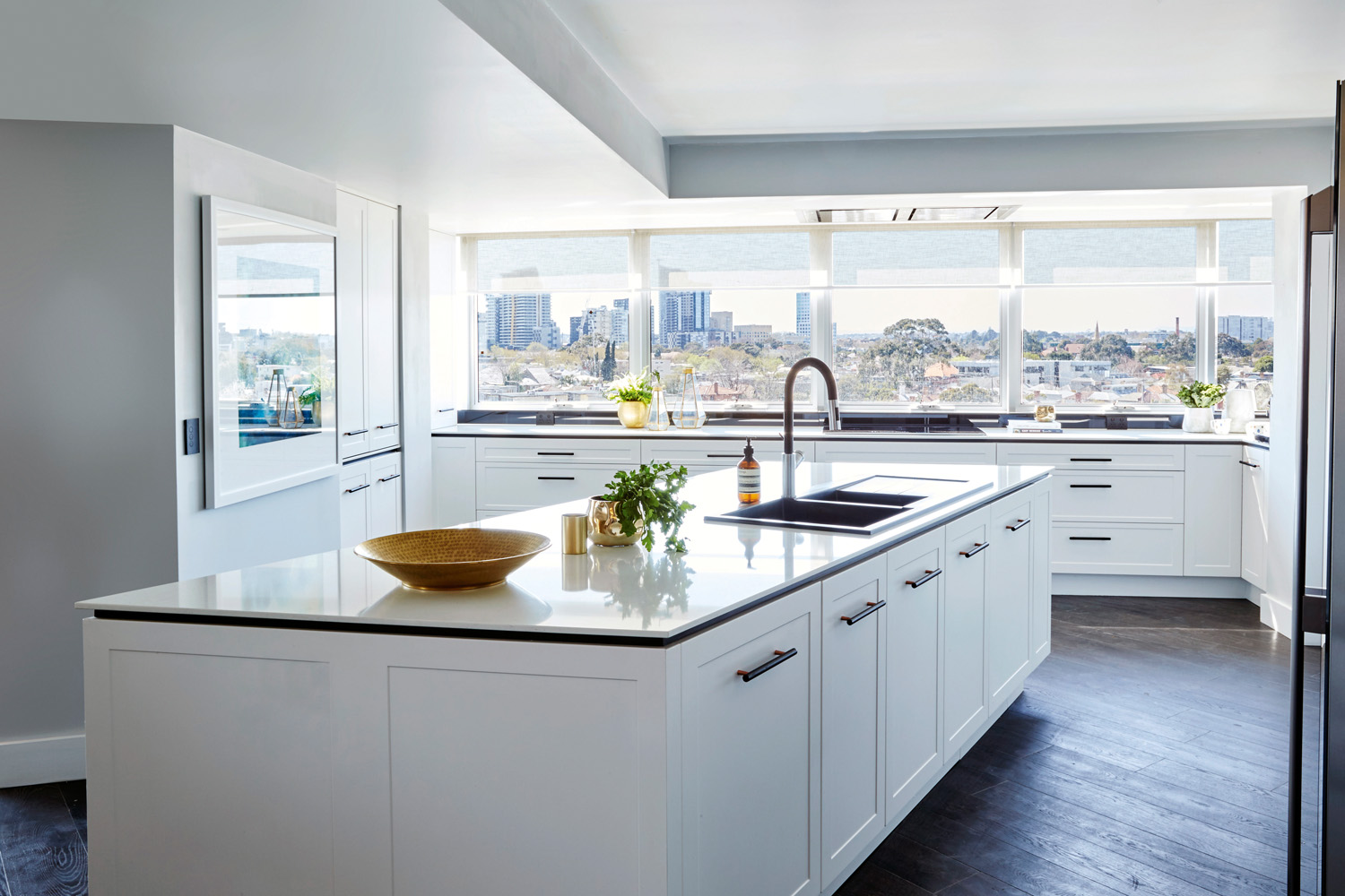 Removing a wall allowed them to open their kitchen space, achieving a great sense of flow to the connecting dining, living and laundry areas. They paired classic white Shaker profile doors with contrasting shadowline detail. The new-style black timber and copper handles add a sense of cohesion and sophistication. The Silestone benchtops in Ariel are cleverly angled to complement the shape of the room, completing this calm and tranquil space.