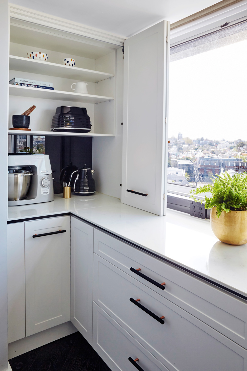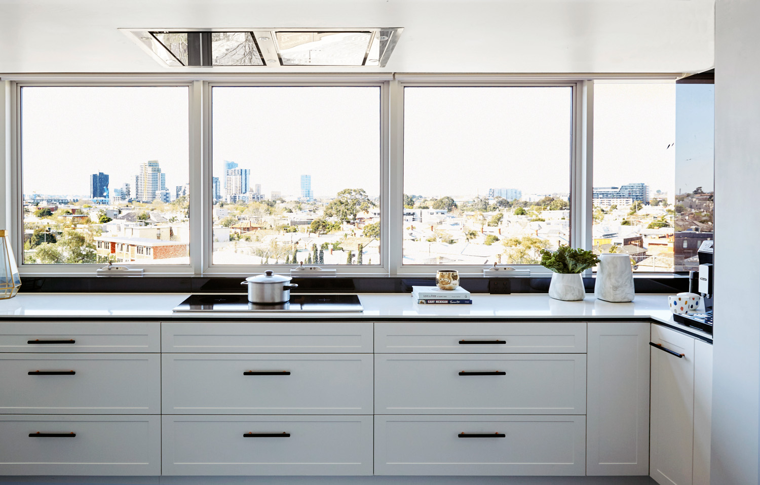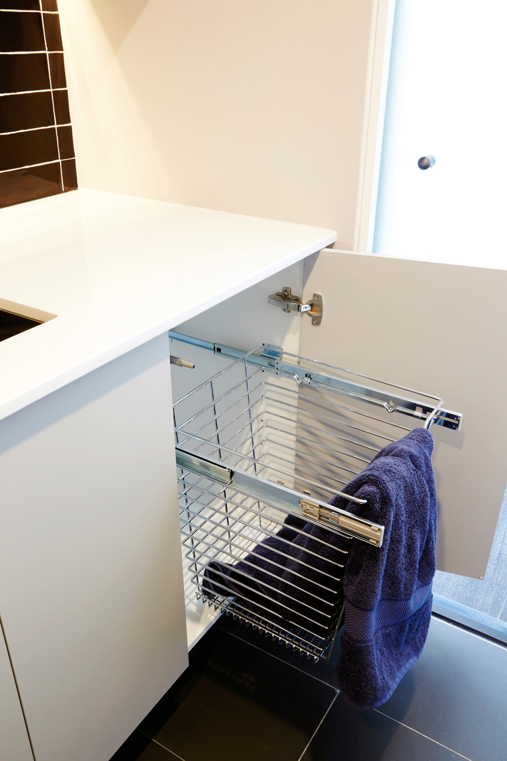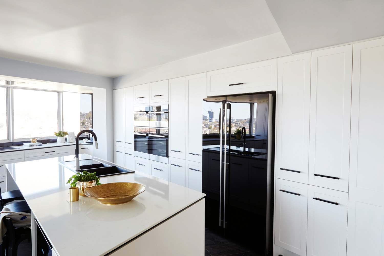 Removing a wall allowed them to open their kitchen space, achieving a great sense of flow to the connecting dining, living and laundry areas. They paired classic white Shaker profile doors with contrasting shadowline detail. The new-style black timber and copper handles add a sense of cohesion and sophistication. The Silestone benchtops in Ariel are cleverly angled to complement the shape of the room, completing this calm and tranquil space.