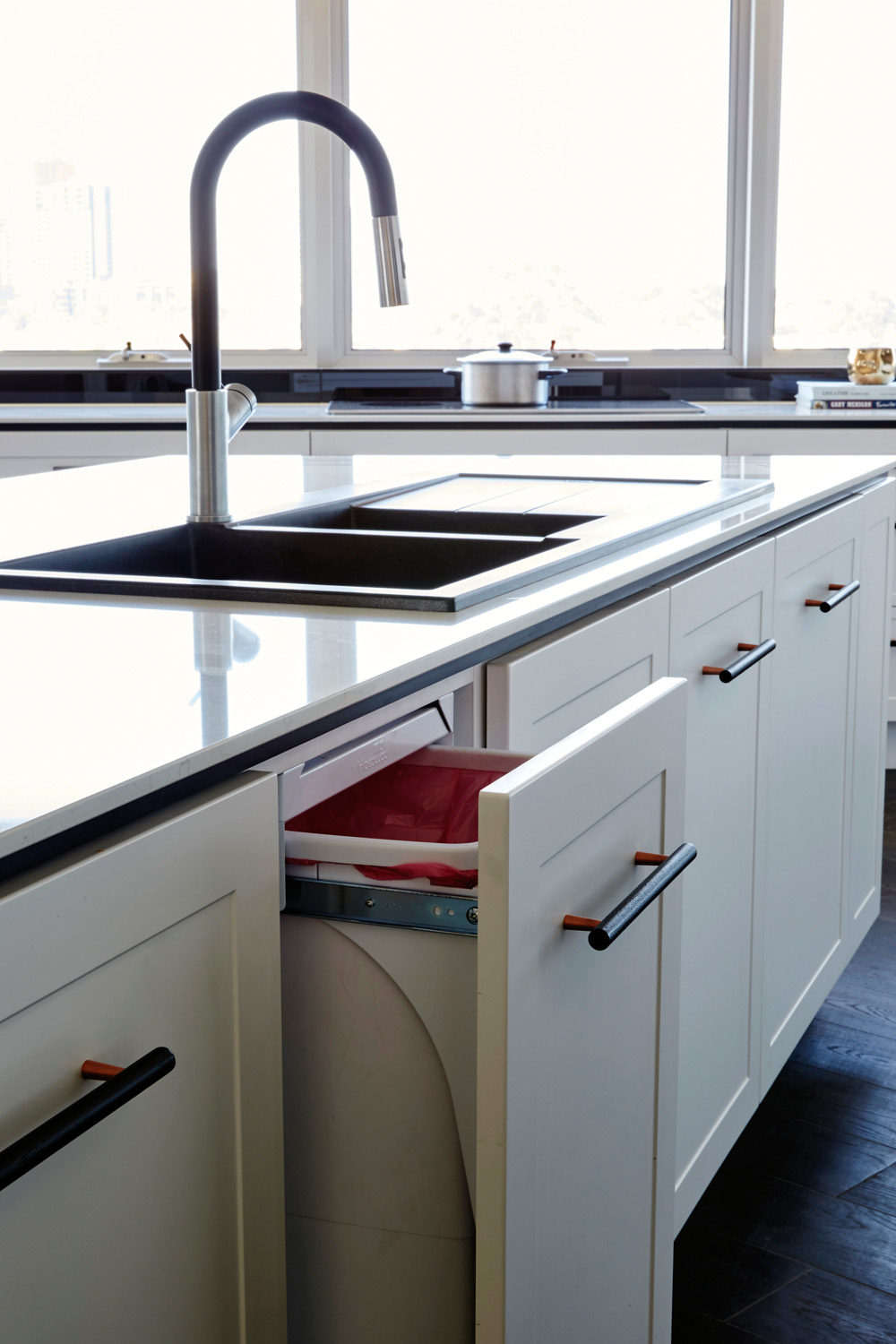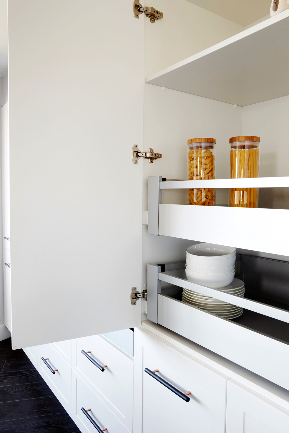 Deep glass-sided drawers plus vertical internal drawers either side of the oven offer fantastic storage space. The additional sink, hidden behind bifold doors, makes for a fantastic prep area for entertaining. Add in the array of Electrolux appliances — from steam oven to induction cooktop — and you’ve got this stunning, timeless take on a Shaker kitchen design.