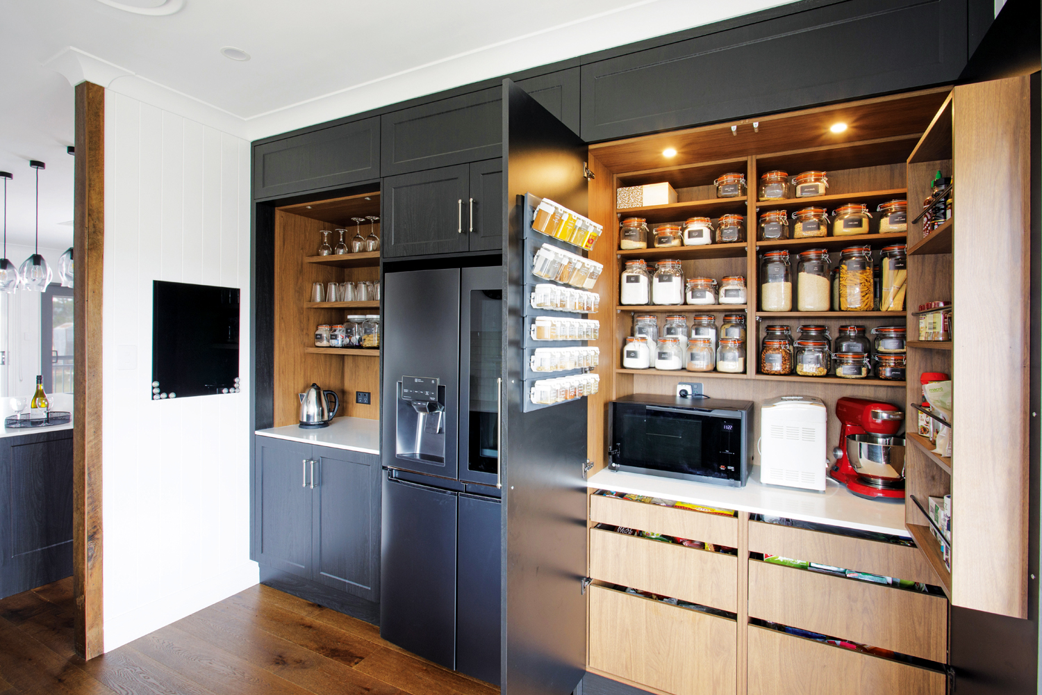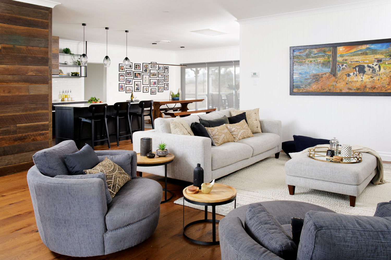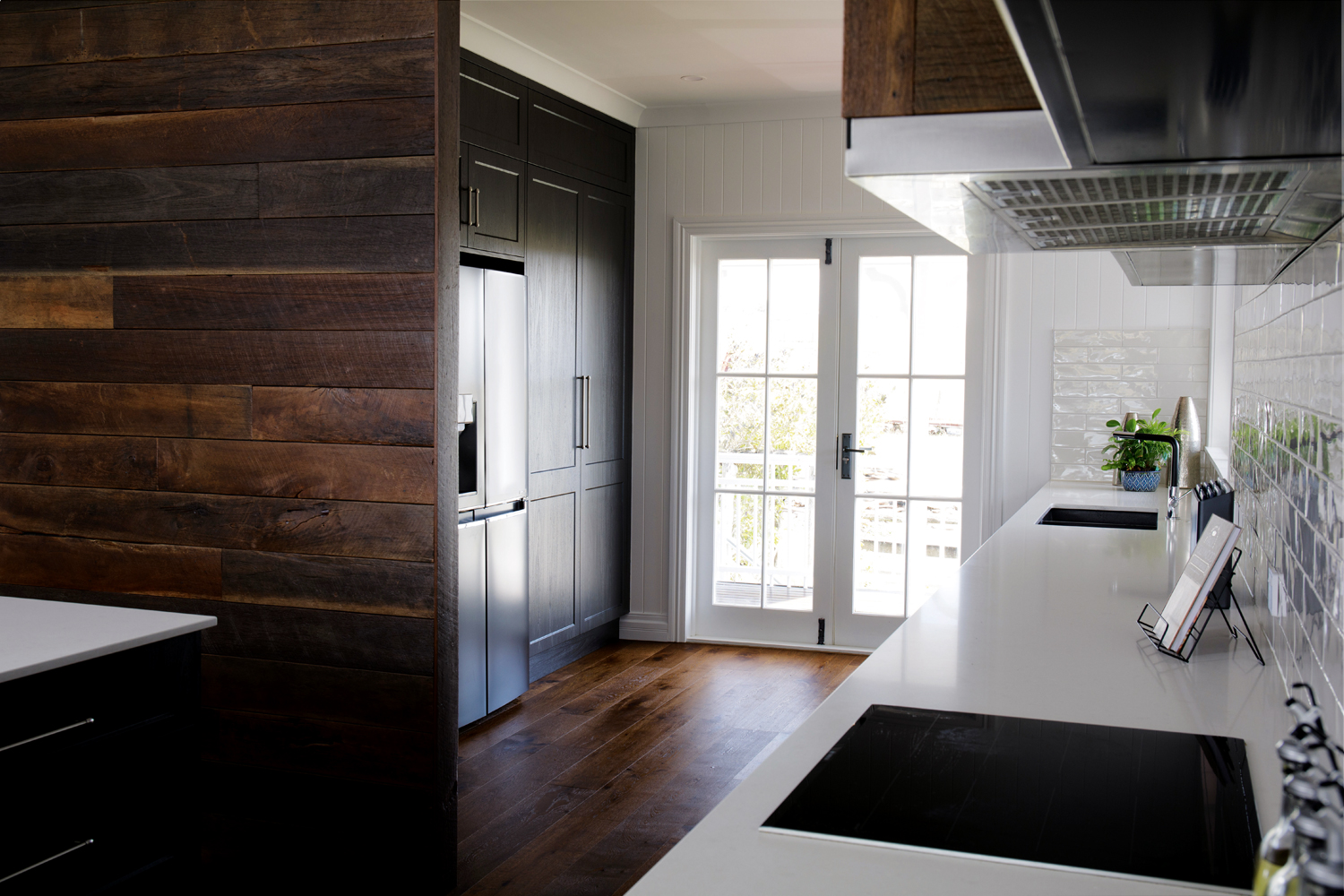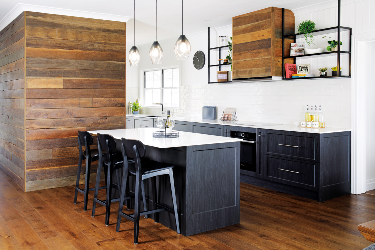 The new kitchen makes all its owners’ dreams a reality and boasts a butler’s pantry spoilt with storage, as well as a hidden laundry. The main kitchen area is swathed in almost-black cabinetry and black metal shelving, which sits comfortably alongside the recycled hardwood. A textured white splashback and new engineered hardwood timber flooring complete the scene, with the flooring specifically chosen to anchor the space and provide visual continuity throughout.