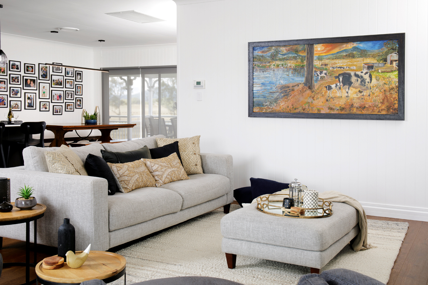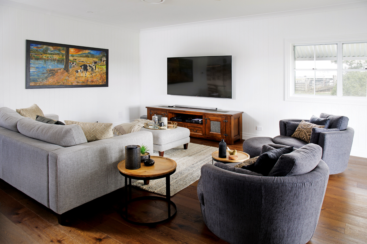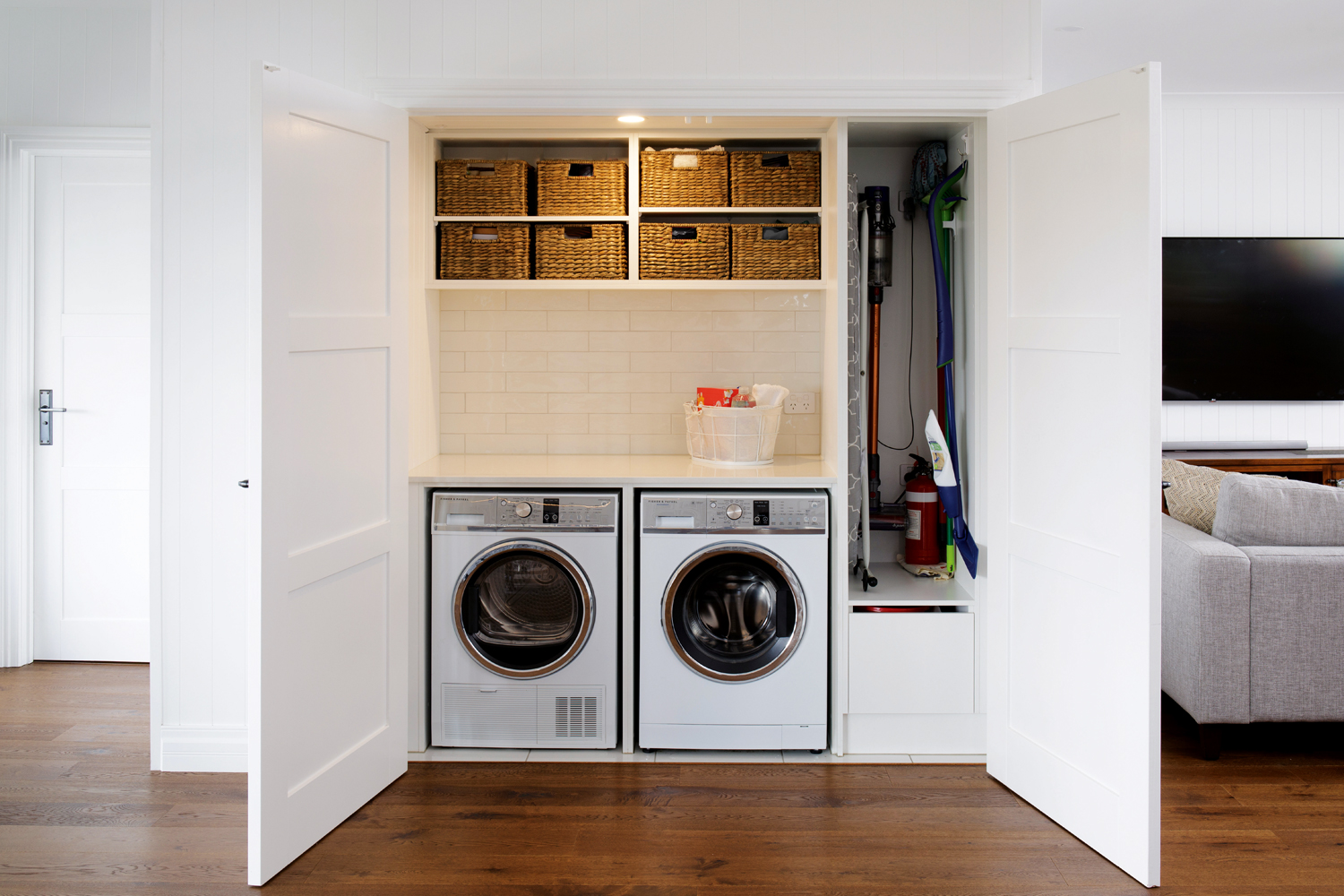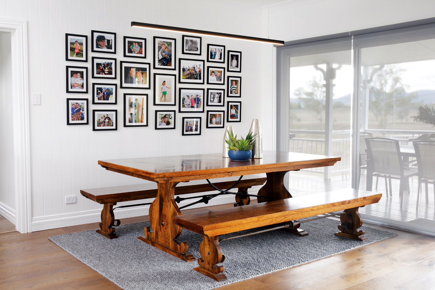 The new kitchen makes all its owners’ dreams a reality and boasts a butler’s pantry spoilt with storage, as well as a hidden laundry. The main kitchen area is swathed in almost-black cabinetry and black metal shelving, which sits comfortably alongside the recycled hardwood. A textured white splashback and new engineered hardwood timber flooring complete the scene, with the flooring specifically chosen to anchor the space and provide visual continuity throughout.