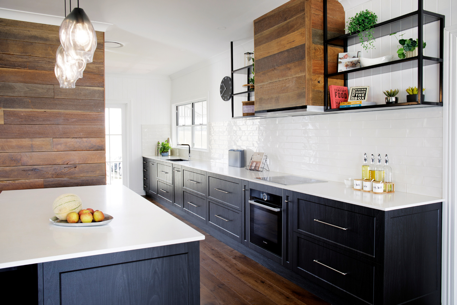 Recycled hardwood, locally sourced products and hand-blown glass pendant lights take centre stage in this ergonomically designed, high-tech kitchen.