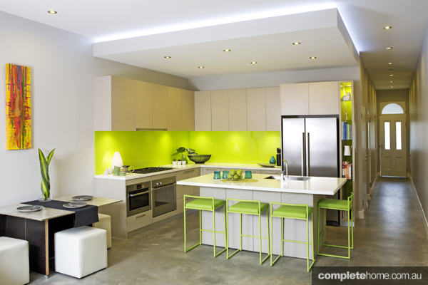 “Budget was an important consideration for the owners of this inner-west Sydney terrace and one of them, a builder by profession, opted to take on several key tasks, including construction of the feature bulkhead which skillfully defines the kitchen space, and fabrication of the elegant solid-surface benchtop. My task was to make the space function efficiently and to find a proper home for every appliance and accessory. The real masterstroke was the choice of colours by the other owner, an art teacher. The glass splashback in Lemon Sorbet is a striking design feature and contrasts with the textured laminate on the wall cabinets and island in Gesso Lini matt, and floor cabinets in Snowgum sheen. The tall, open-shelf cabinet next to the fridge provides a home for books and treasured items and neatly bookends the room.”