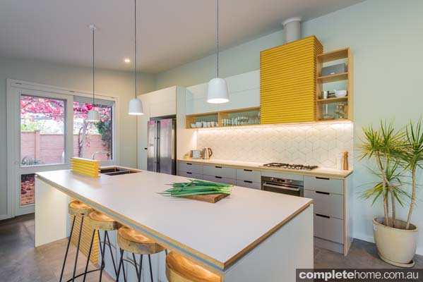 Aside from the practical new layout and design, the environmental considerations of the new kitchen were important to this family. “It was our intention to use materials that would have minimal impact on the environment and our family’s health,” say the homeowners. As such, low- VOC materials (including paints and cabinetry) were used, the underfloor heating utilises solar power and, rather than particle board, Australian hoop pine plywood has been used. “We actually took inspiration for the kitchen design from the edge pattern on the plywood.”