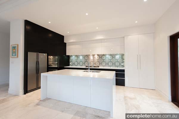 “With light, balance and breathtaking lines, this kitchen embodies the very essence of a modern streamlined space. The kitchen flaunts a chic linear design that is enhanced by long handleless cabinets, a simple colour palette and sleek stainless-steel appliances. An exciting and powerful statement is created using cabinetry in dark chocolate and white, with a high-gloss finish that is clean, pure and perfectly contemporary. Designed for a family with young children, the kitchen needed to incorporate practical design features and clever storage. While on the outside the drawers are sleek and sophisticated, on the inside they’re packed with clever hardware from Hettich and Blum. Hettich soft-close technology was a must-have for storing crockery and other breakable items in the drawers and Blum Aventos lift-up hardware provides practical storage. Inner drawers are hidden in the cupboards at the back of island bench for the desired wine storage. Dishwasher and microwave appliances are also hidden from view, maintaining the streamlined look as well as keeping them away from two little children. A bold chunky island bench was custom-built with 60mm slab ends and benchtop, plus a 20mm benchtop to the inner side surface to allow for the integrated dishwasher. On the splashback, charming patterned tiles are a breath of fresh air. LED race lights underneath the overheads keep the space perfectly lit. This elegant kitchen is more than a design statement; it is a timeless and practical for a growing family.”