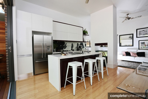 A neutral palette will help achieve a seamless, uncluttered look. When choosing materials, gloss finishes will help bounce light around the room, and glass and mirrored splashbacks will reflect surrounds, creating the illusion of space.