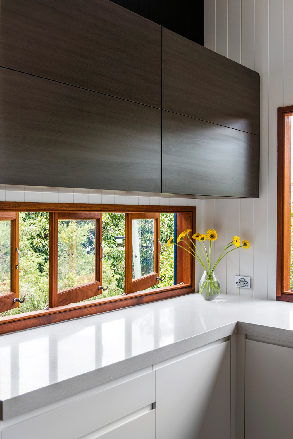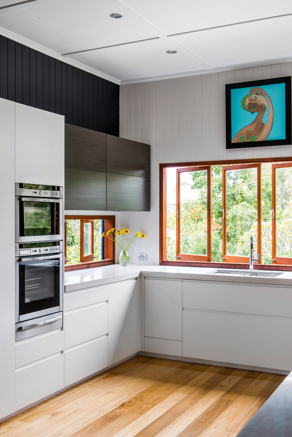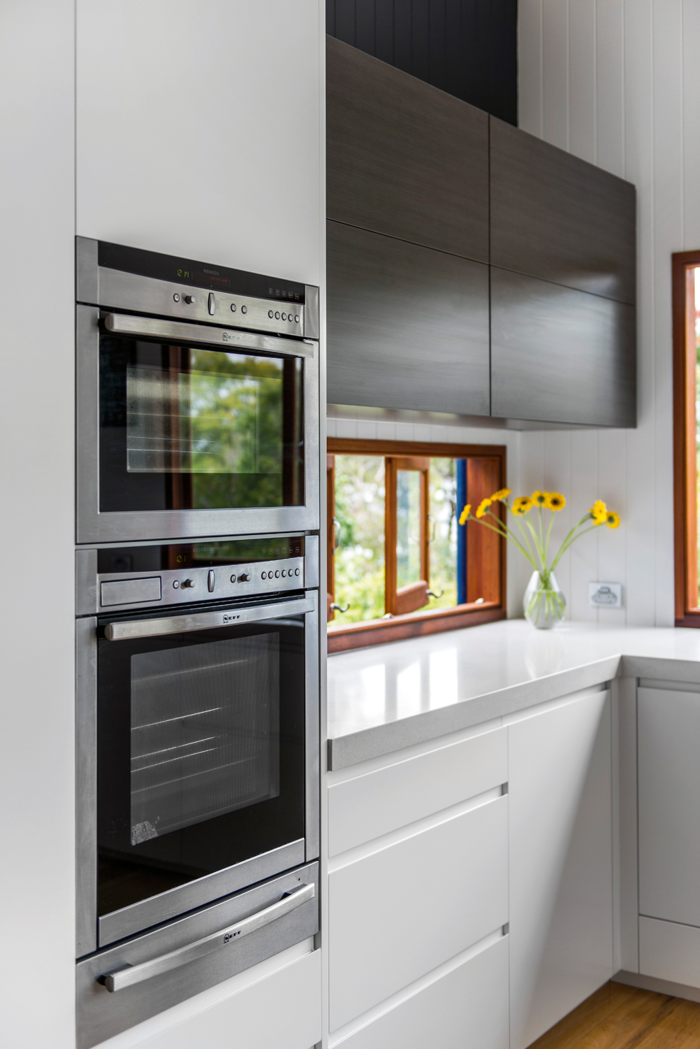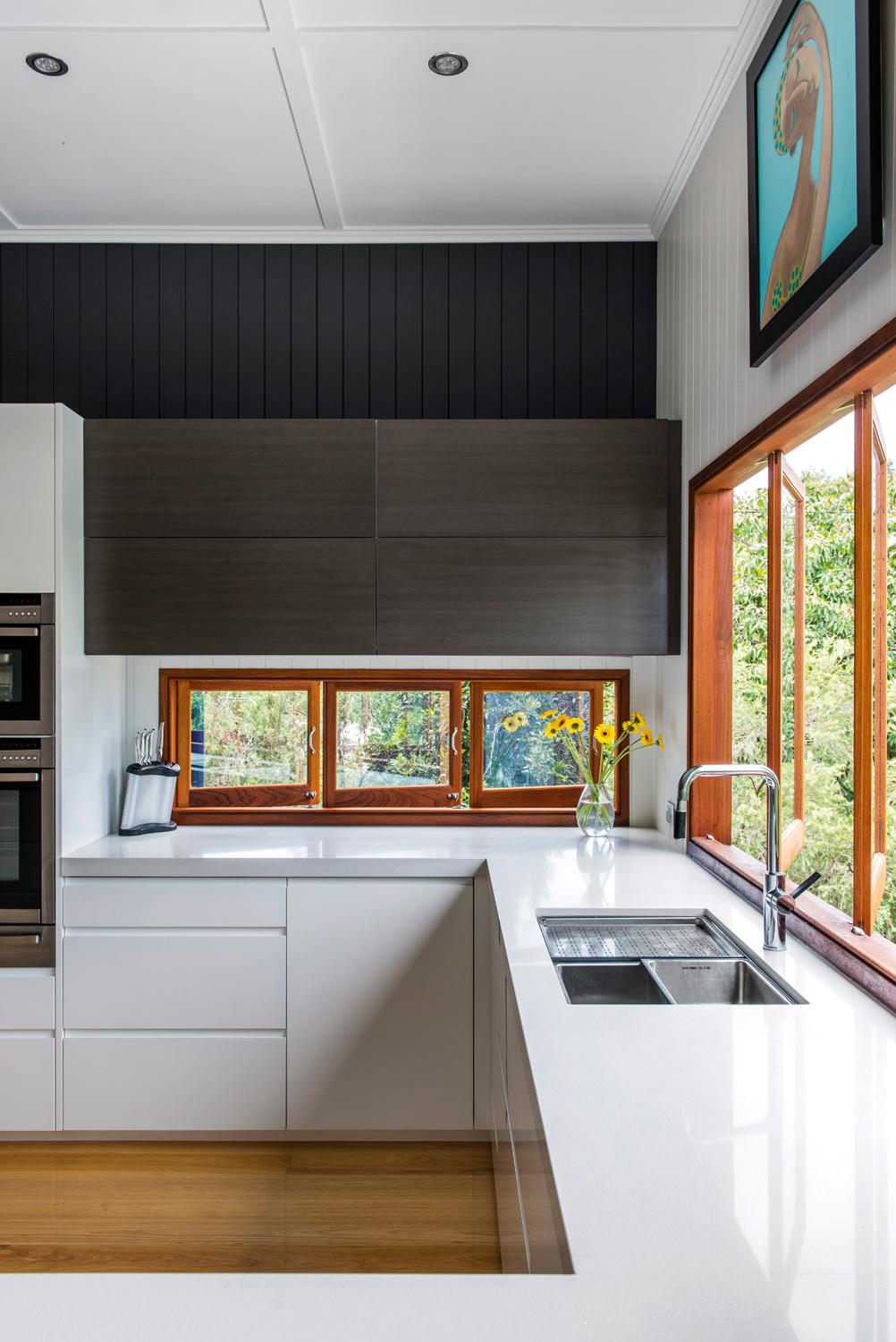 Although the design is modern with lots of clean lines, it’s timeless because of the classic colour palette we selected. The kitchen features loads of benchtop space and storage, as well as an office area to keep mail and other paperwork out of sight. We used Blum’s electronic Servo-Drive system for the wall cabinets, which open to the touch and close with the press of a button. The 60mm thick benchtop is a design feature as it creates visual impact. Drawers are used throughout the kitchen as they are the best option for storage.”