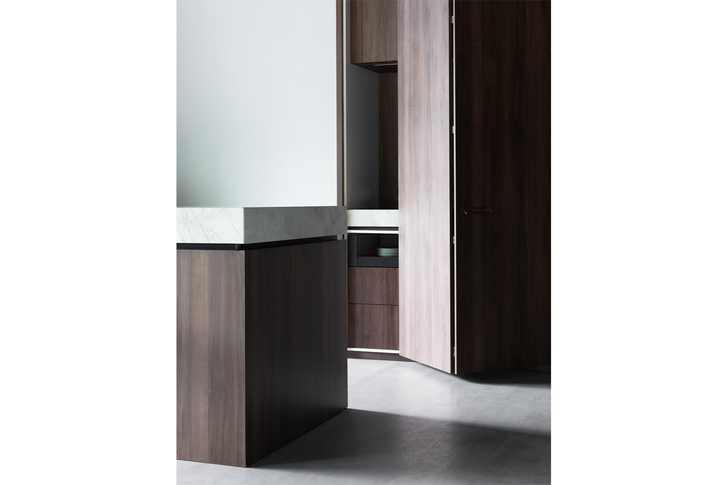 As you move through pockets of the showroom you immerse yourself in the world of Hettich, from the kitchen to the bathroom, wardrobe, laundry and office. Distinctly blending together to visually represent the quality fittings of a functional working home like environment.