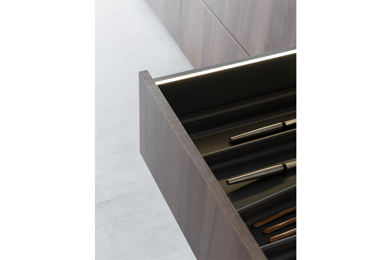 Upon opening the WingLine L bi-folding doors which emulate the ideal kitchen cabinet, you’ll be able to find AvanTech YOU internal drawers which not only provide Illumination LED lighting, but are complimented by glass inlays that showcase various kitchenware inside beautifully.