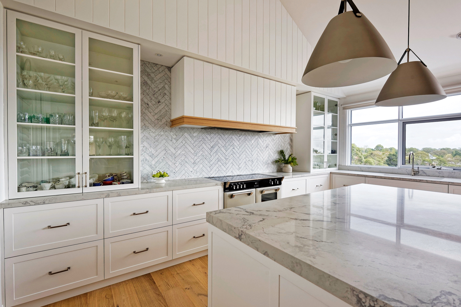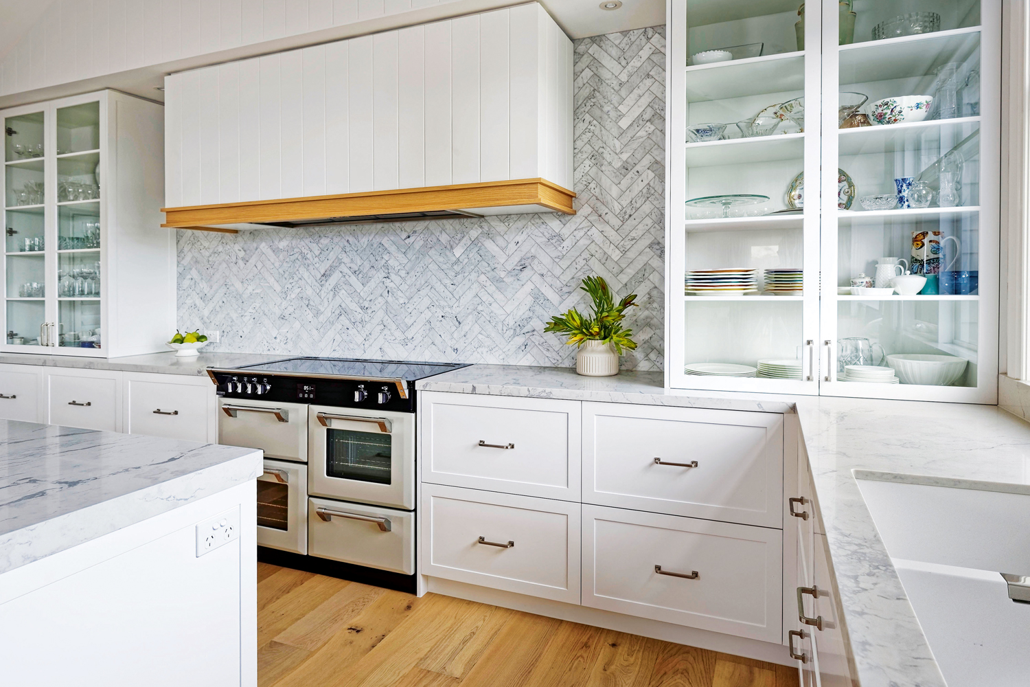 Herringbone patterning in a Carrara marble finish draws the eye to the splashback, which sits alongside glass cabinets that edge the back wall. The owners love to showcase some of the special crockery and glassware they have collected over the years, so the glass cabinets were the perfect choice for this kitchen.