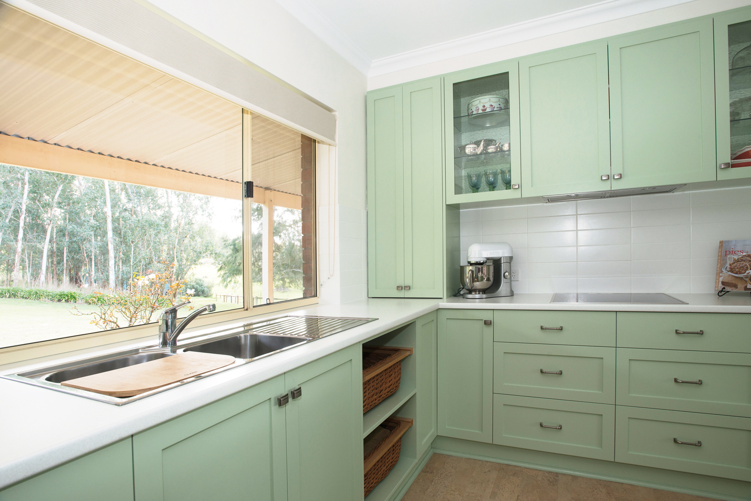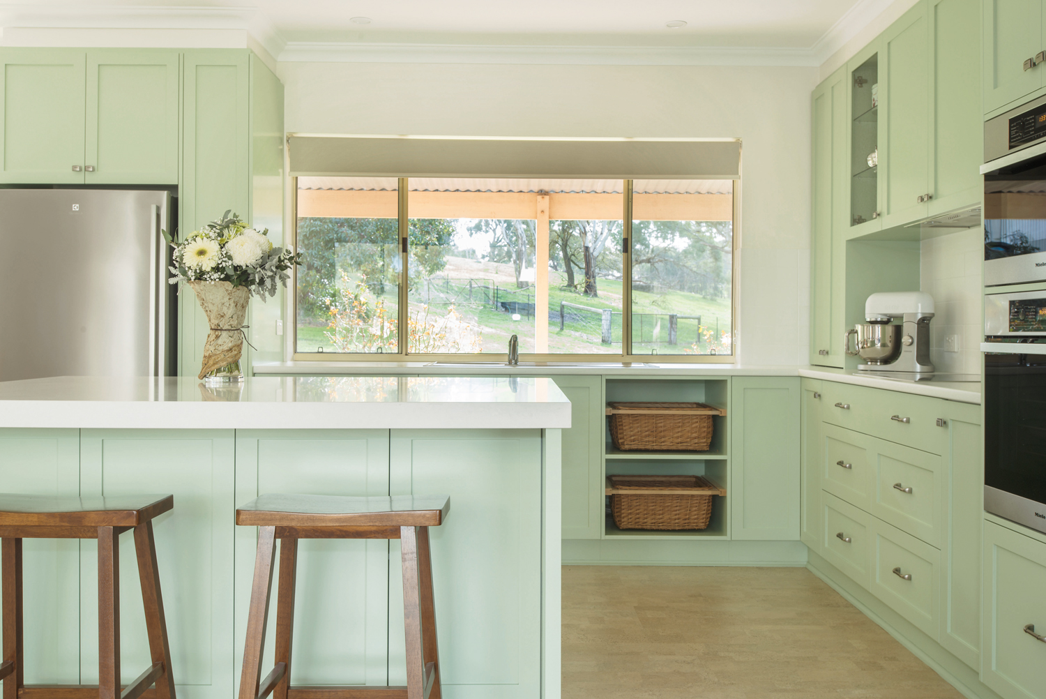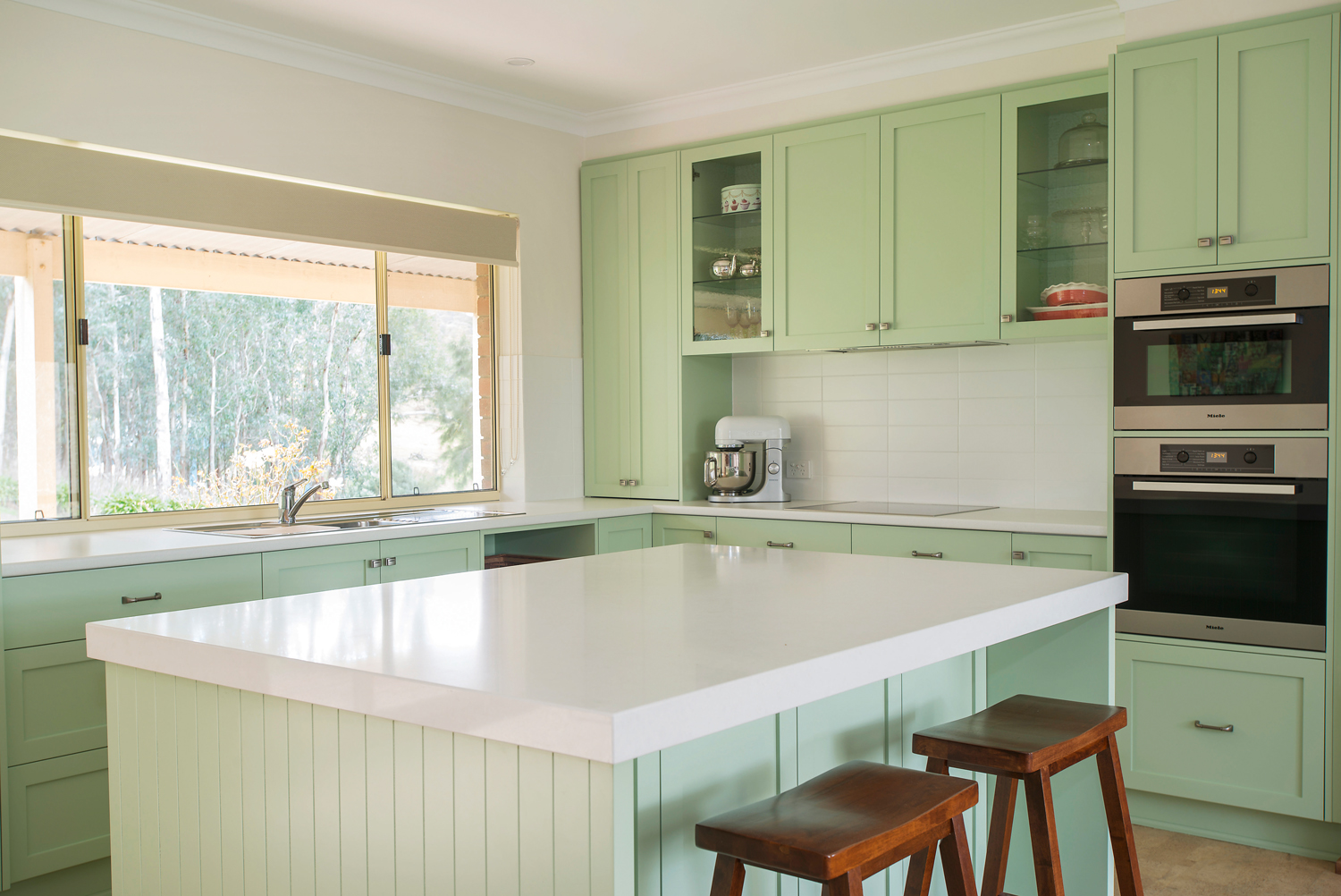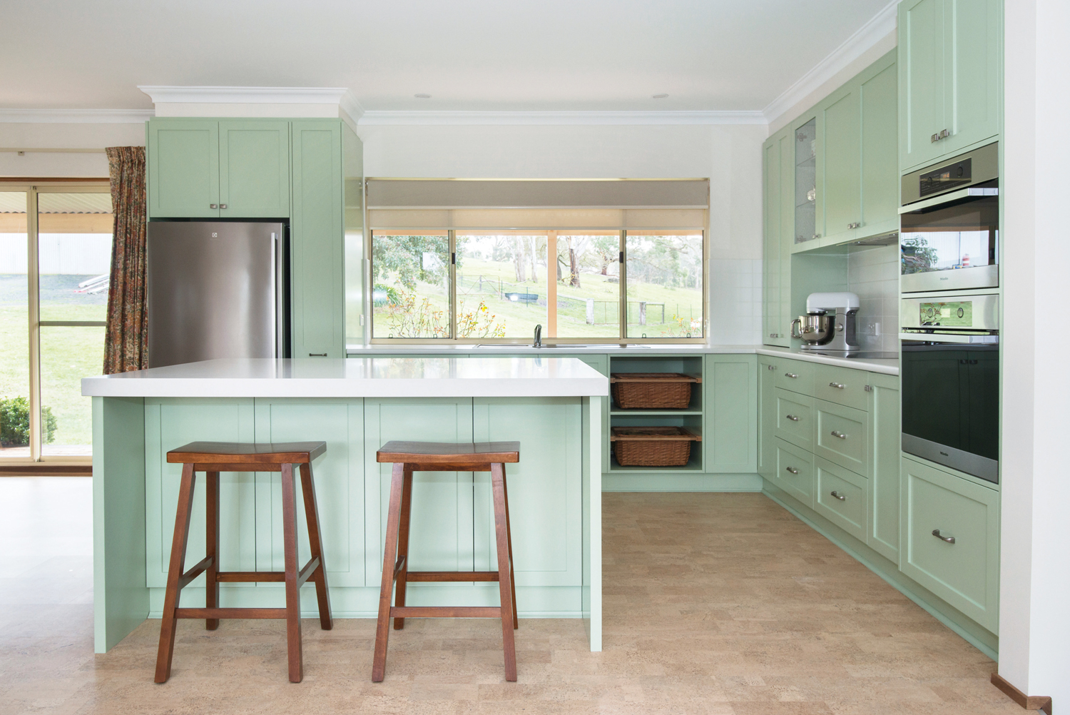 “This beautiful kitchen is full of character and reflective of the rural style of the property. Our clients wanted a practical space with Shaker-style cabinets and an island bench with plenty of drawers and preparation space.