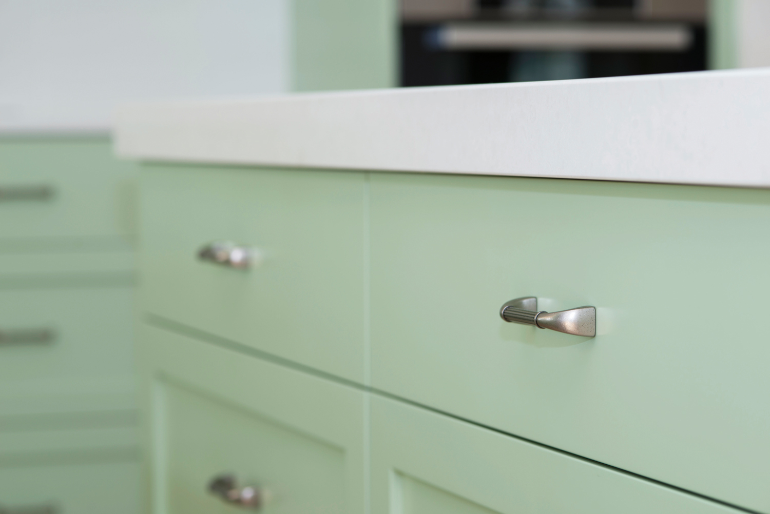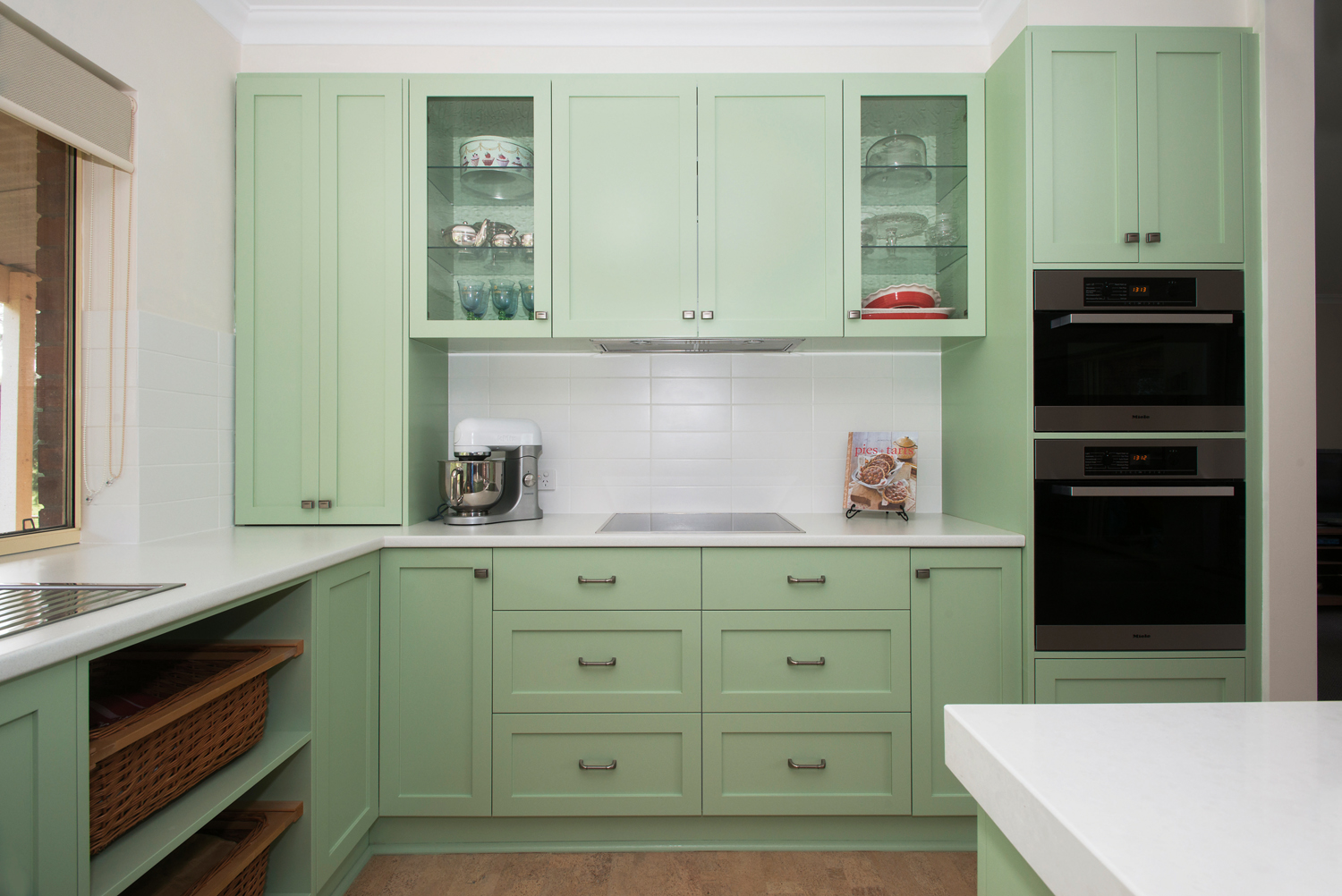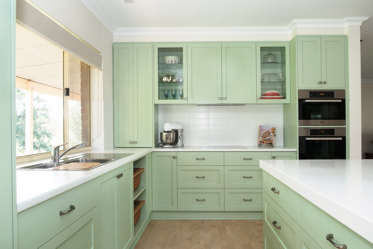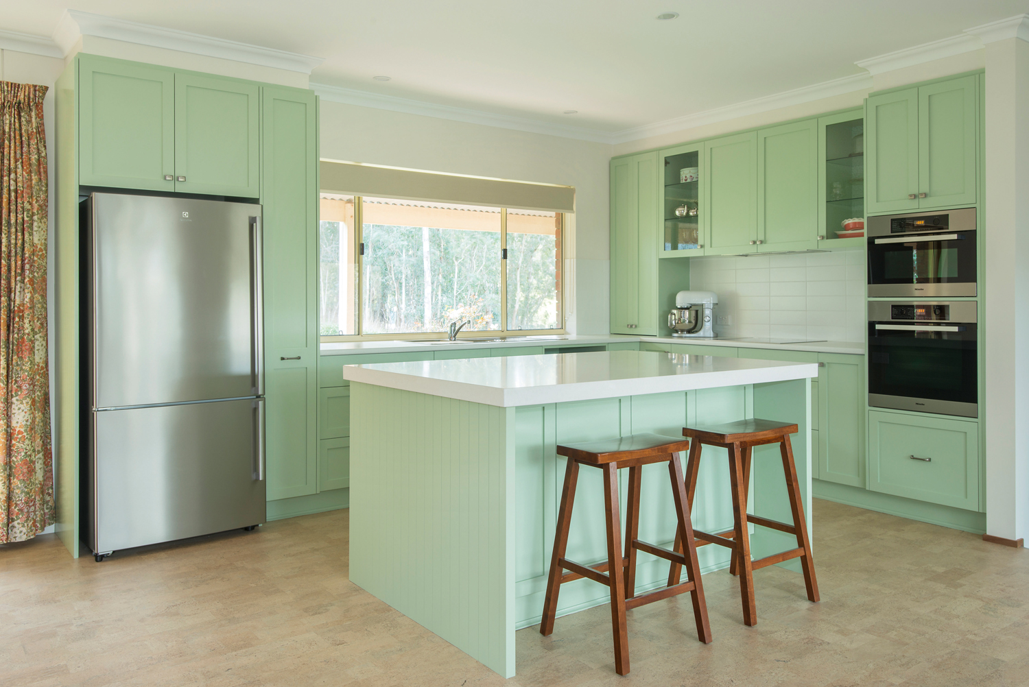 The kitchen was painted in a stunning mint green colour that does not overpower the space, yet complements the cabinetry and light cork flooring.