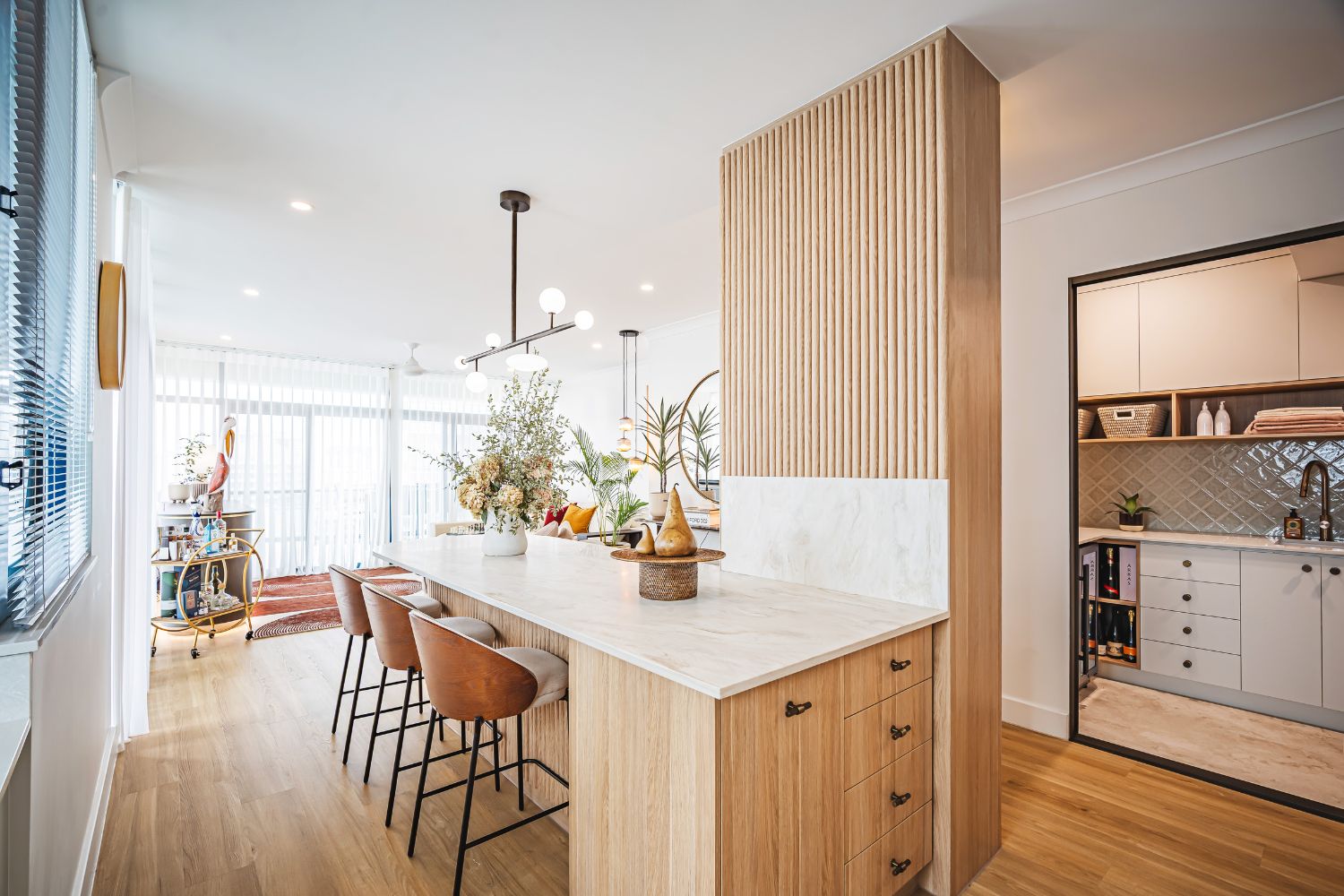 Central to the redesign was the kitchen, now reconfigured to maximise both form and function. By absorbing two redundant storerooms, the layout was completely flipped, making room for a generous laundry–butler’s pantry and a kitchen where the island commands attention. Serving as the heart of the home, the island provides space for casual dining, conversation, and effortless hosting, while the surrounding cabinetry and storage solutions enhance practicality.