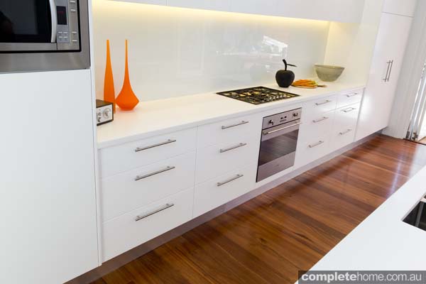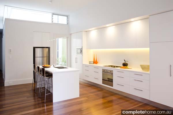 A white palette was chosen for all cabinet and benchtop surfaces to enhance the flood of natural light and to contrast with and complement the richness of polished recycled floorboards used throughout the house. A galley-style kitchen design harks back to the Victorian heritage of the building but a central island bench gives a modern twist, allowing easy access to appliances and more food preparation and entertainment space. To fulfil the client’s brief for more storage areas, large soft-close drawers were included below the benchtop, handleless wall cabinets above and tall cabinets at either end. The result is a streamlined, clutter-free design which is perfect for dining and entertaining whether indoors or out.”