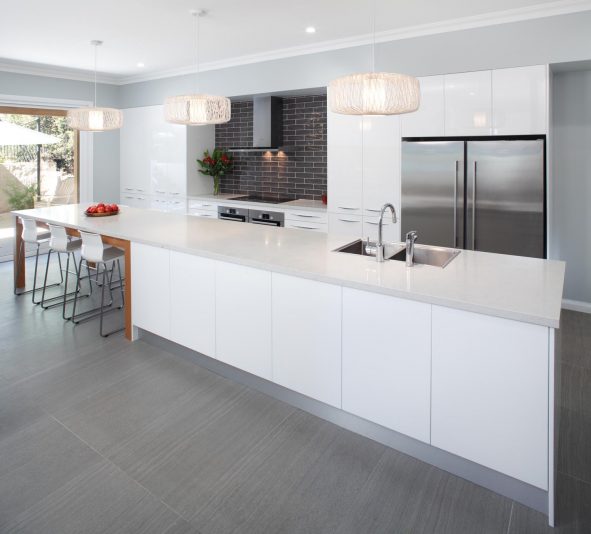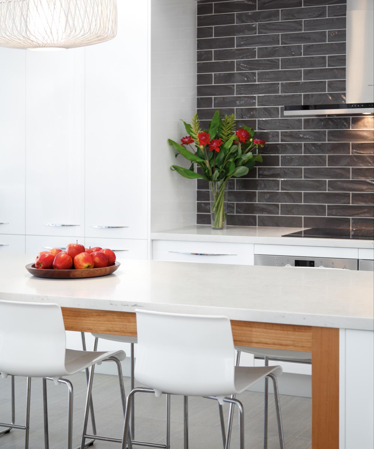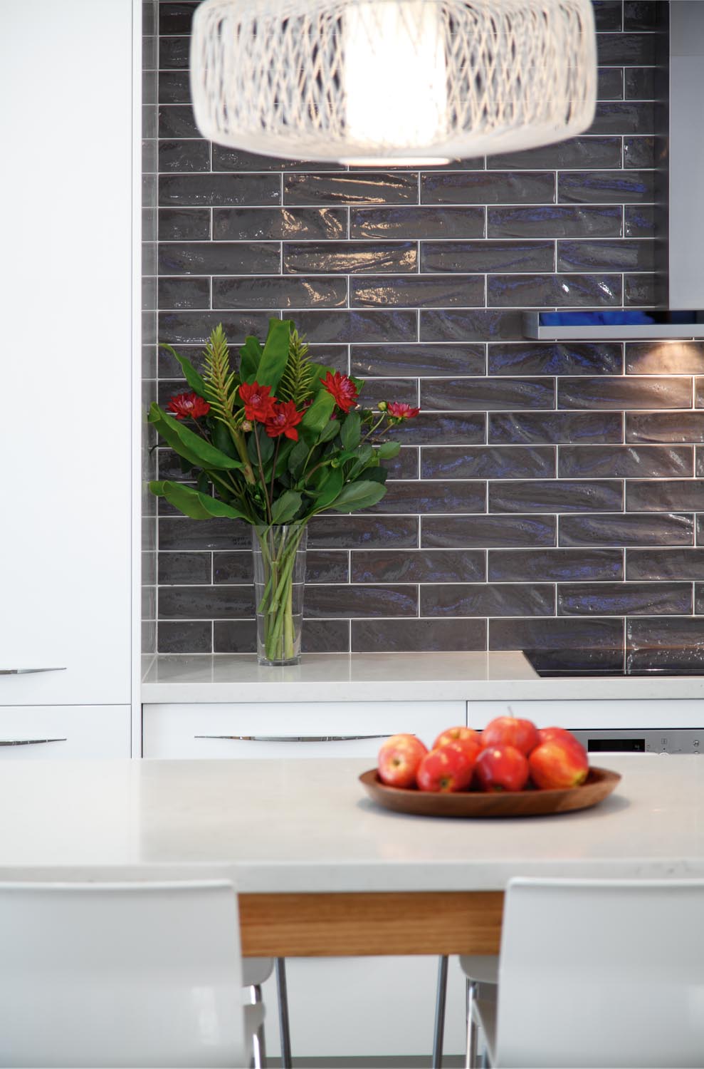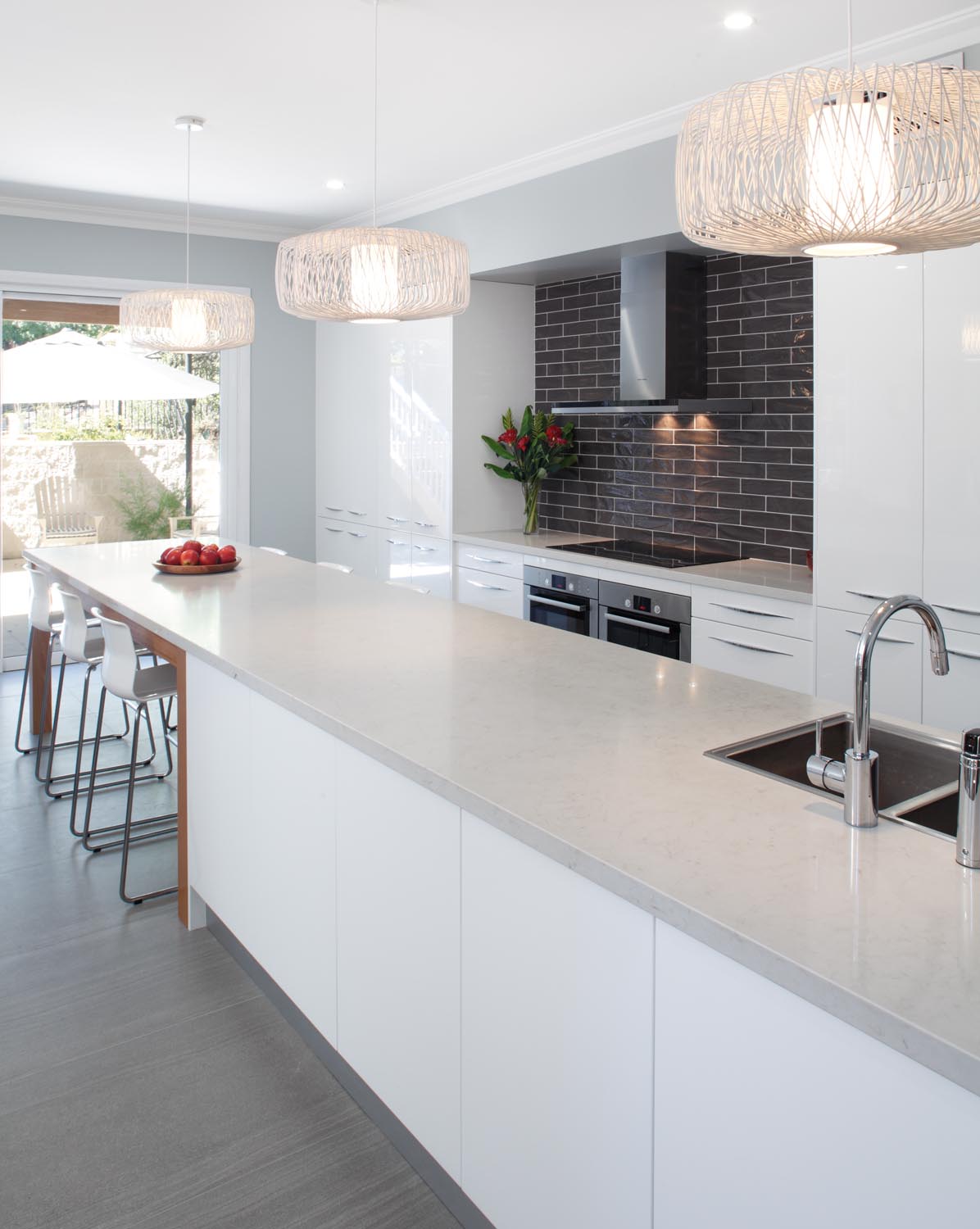 The dark grey tile splashback is elegant and complements the space. Extensive windows brighten up the room with natural light, while stylish white pendant lights provide light in the evening. Simple silver-handle wares create a sense of minimalism and uniformity. The long island bench provides extensive space for dining, work and entertaining and has plenty of storage.”
