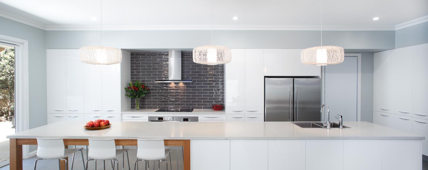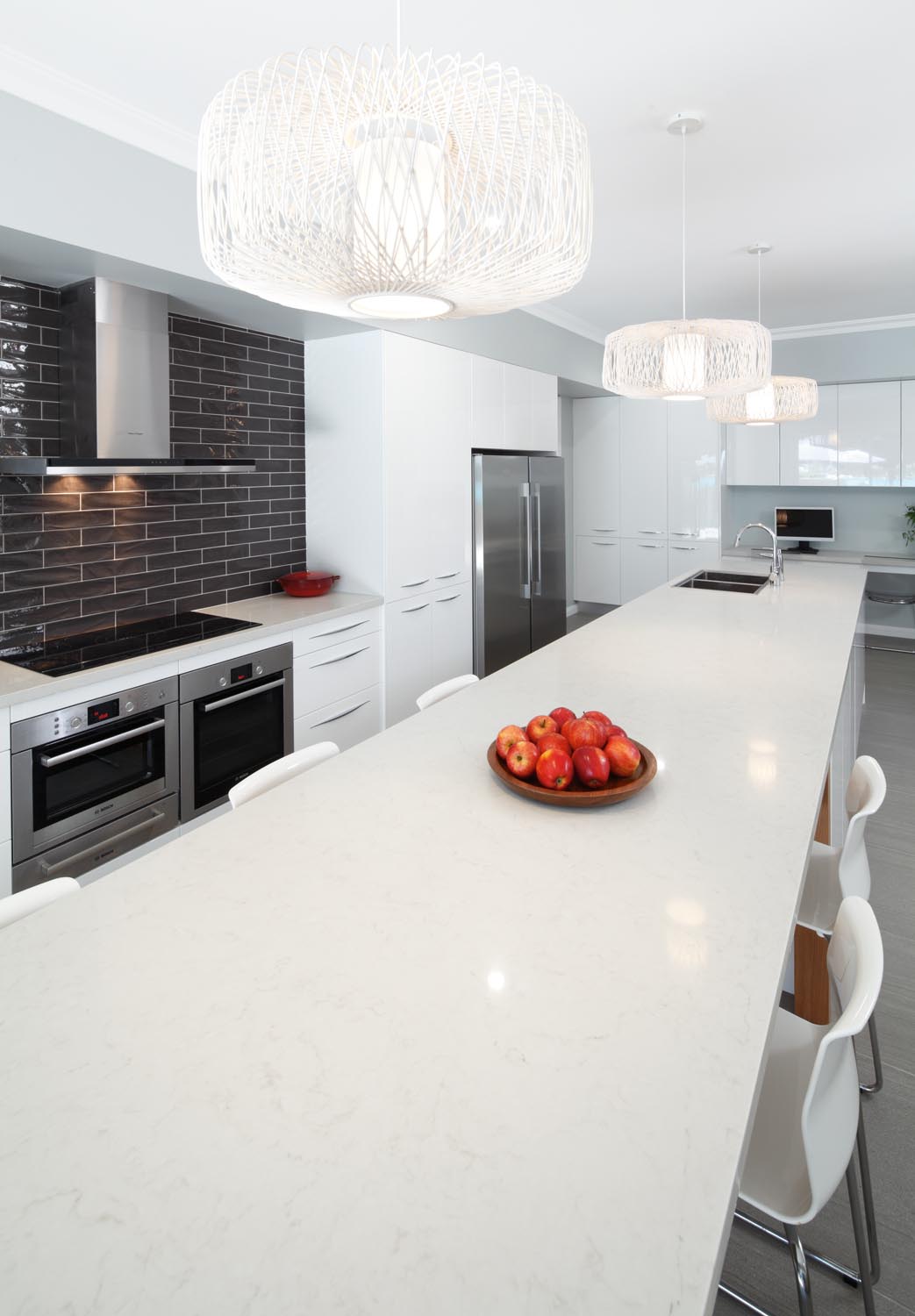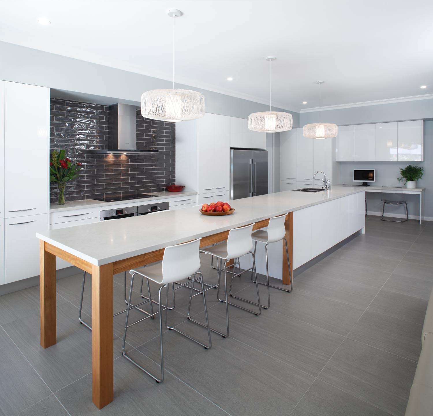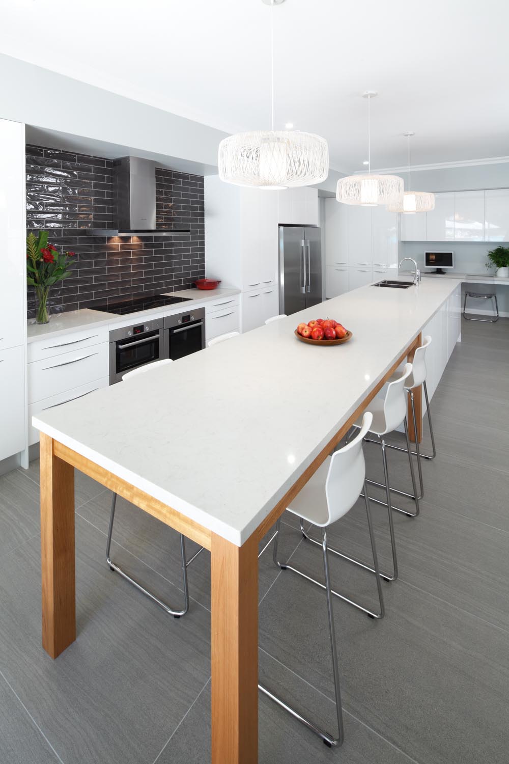The dark grey tile splashback is elegant and complements the space. Extensive windows brighten up the room with natural light, while stylish white pendant lights provide light in the evening. Simple silver-handle wares create a sense of minimalism and uniformity. The long island bench provides extensive space for dining, work and entertaining and has plenty of storage.”