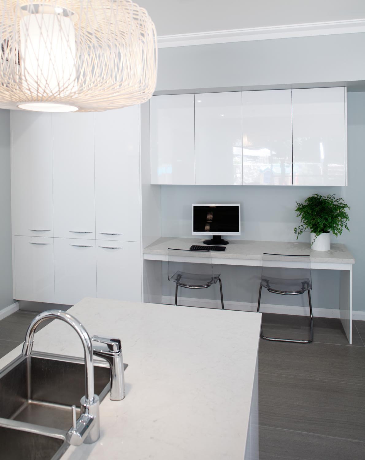 “A large space that is both light and modern was the brief for this contemporary kitchen. The clients wanted a large kitchen with ample storage, as well as a dining and study area to suit the needs of their family. The modern grey-and-white colour scheme opens the room and is beautifully accented with light timber that adds interest.